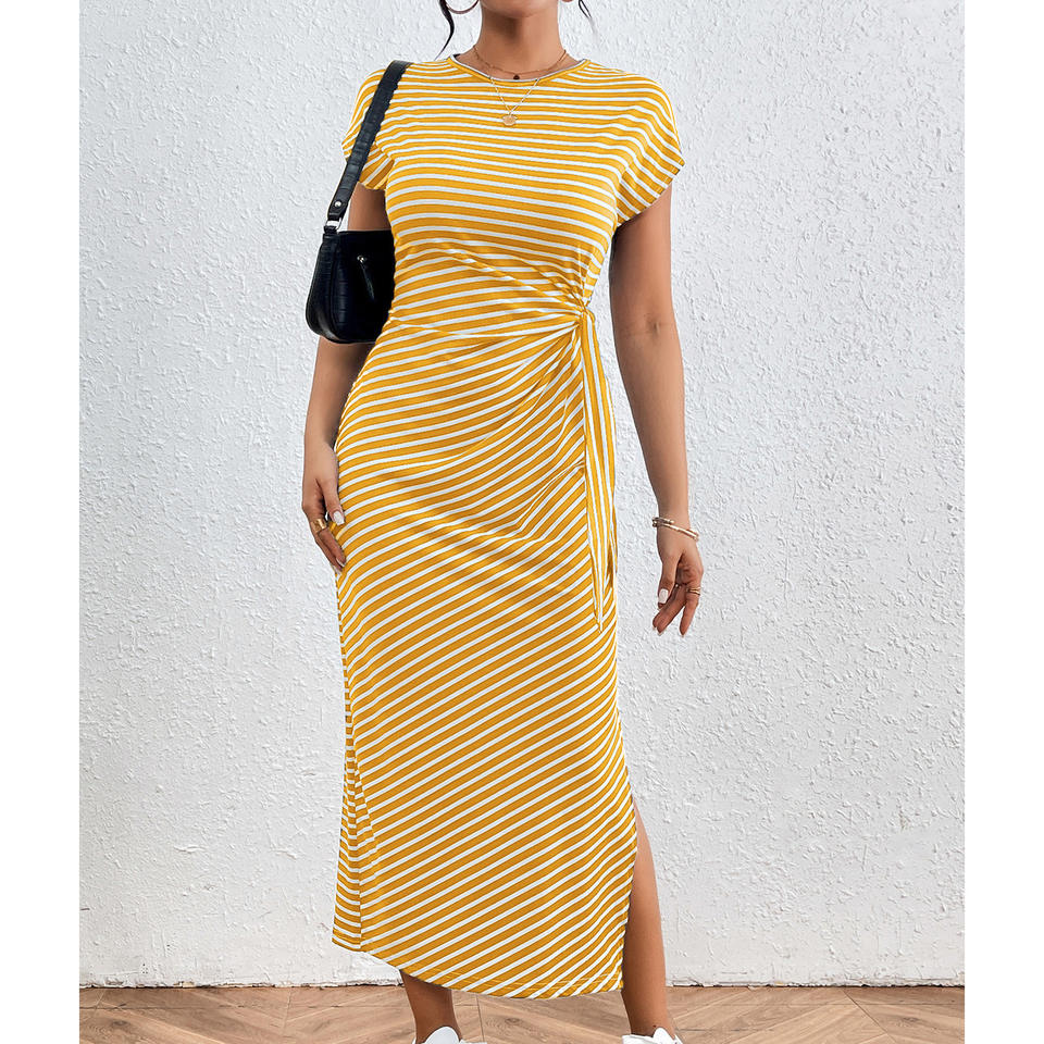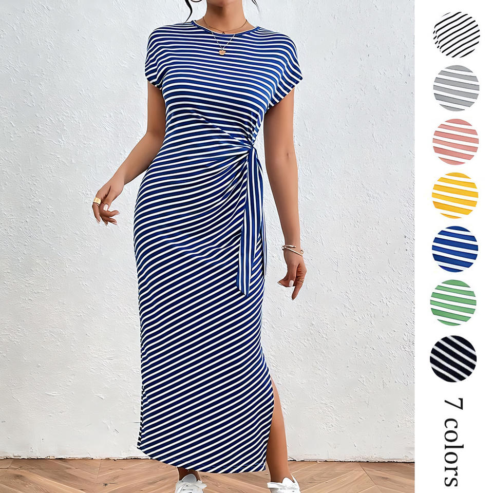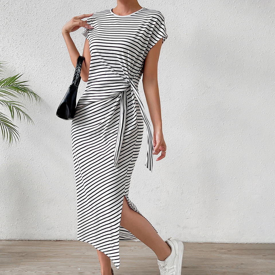 เดรสทรงดินสอผ้าระบายอากาศสำหรับฤดูร้อนใหม่ ทรงปกติ เอวสูง คอทรงโอ ผูกเชือก ทรงเข้ารูป ผ่าข้าง ไม่ยับง่าย เหมาะสำหรับใส่ลำลองกลางแจ้ง