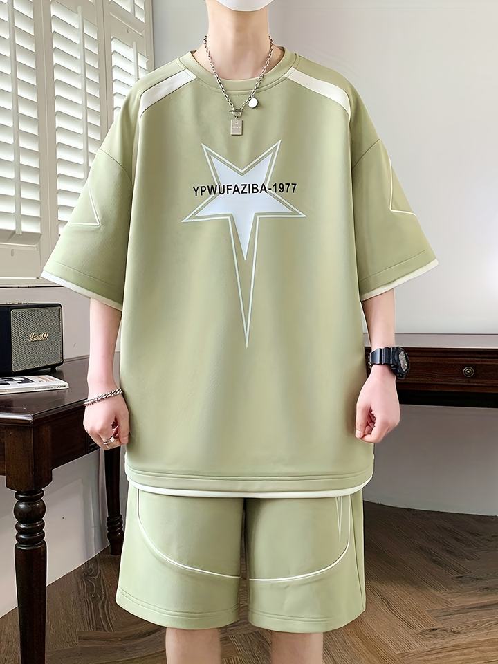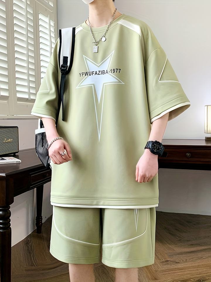 ชุดกีฬาสองชิ้นแฟชั่นลำลองพิมพ์ลายคุณภาพสูงสำหรับฤดูร้อนใหม่ รับสกรีนโลโก้ ระบายอากาศได้ดี ผลิตจากผ้าฝ้ายแท้ สำหรับผู้ชายวัยรุ่น