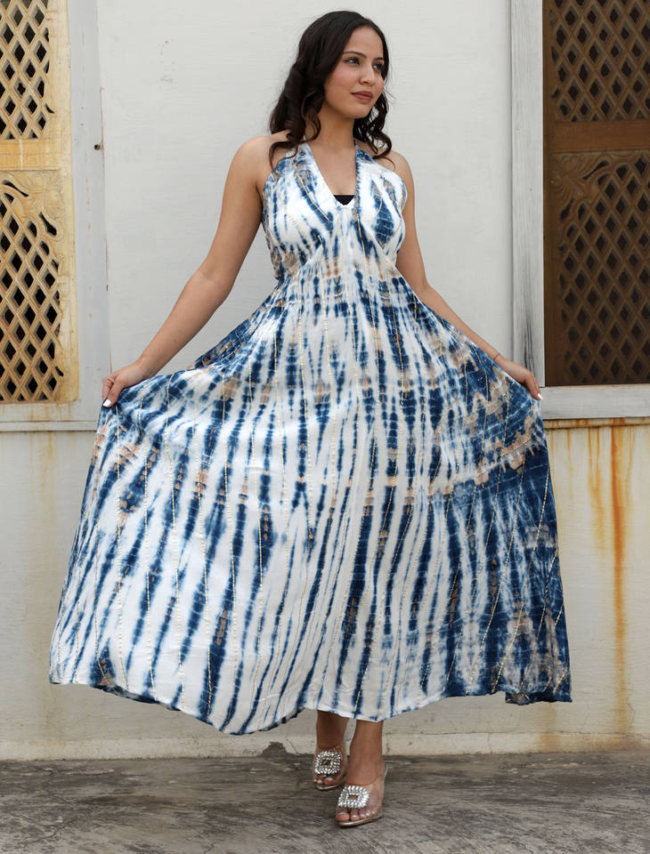 คอลเลคชั่นฤดูร้อนใหม่ชุดเดรสคอวีเว้าหลังตัวยาวผ้าเรยอนมัดย้อมสำหรับผู้หญิงเหมาะสำหรับวันฤดูร้อนที่มีแดด