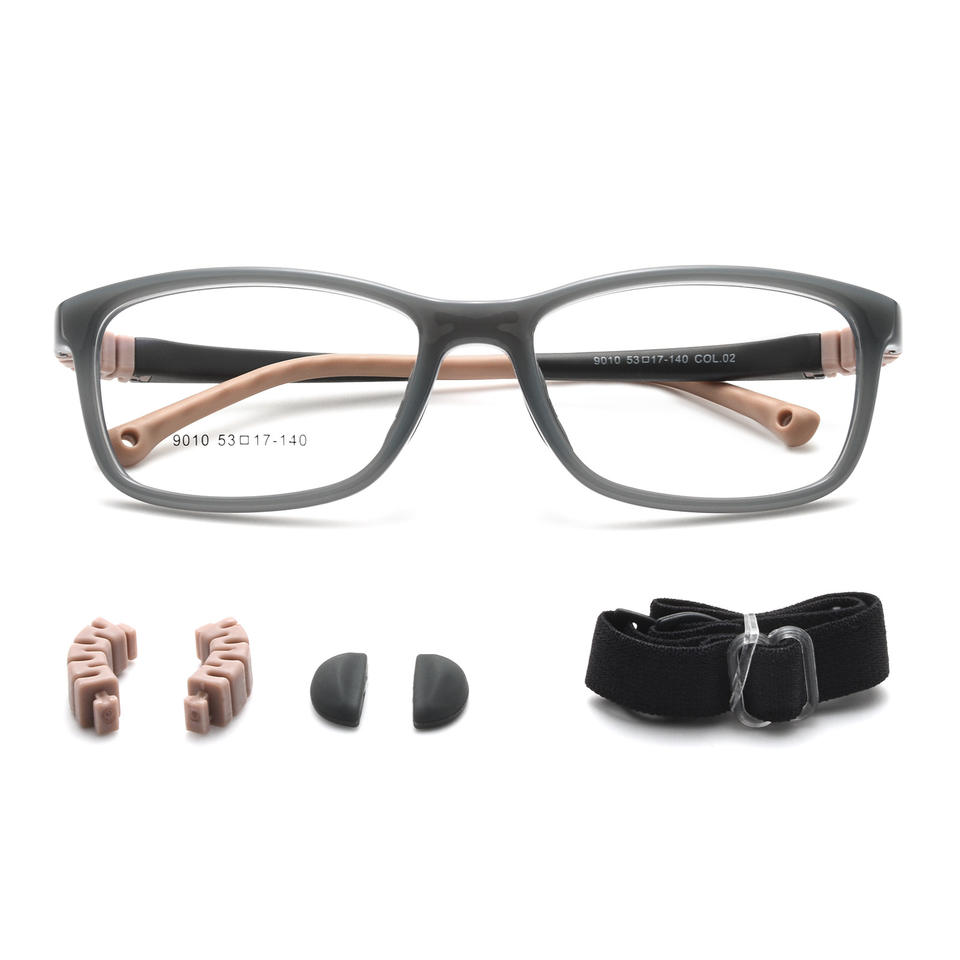 ใหม่ TR90 กรอบแว่นตาเด็ก 9010 ทรงสี่เหลี่ยมน้ำหนักเบาแบบเต็มกรอบพร้อมแผ่นรองจมูกแบบถอดได้และสายรัดสำหรับเด็ก