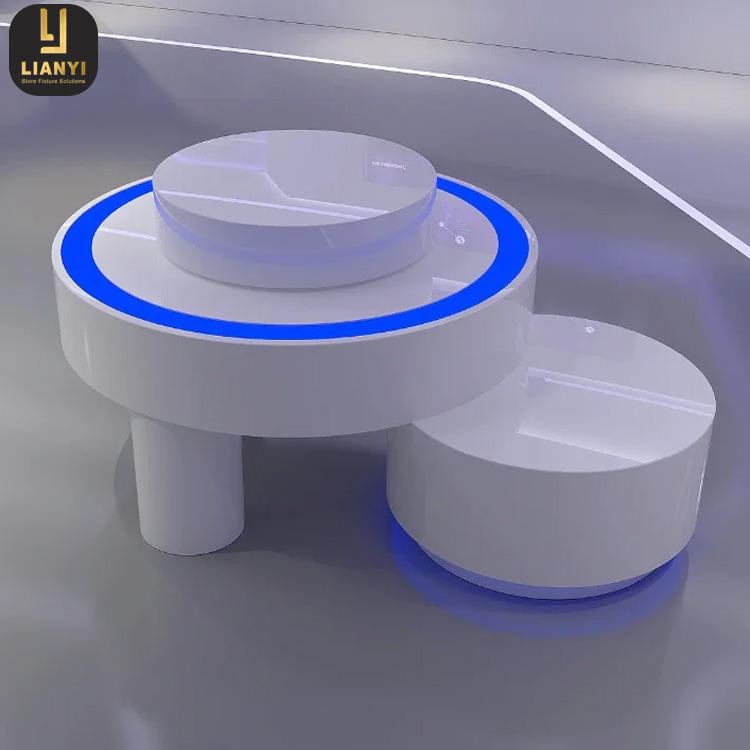 แท่นวางสินค้าอิเล็กทรอนิกส์แบบวงกลมเรืองแสงสำหรับร้านค้าพร้อมชั้นวางไม้วีเนียร์แก้ว MDF