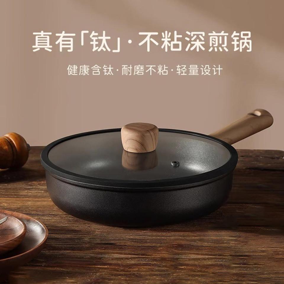 กระทะไทเทเนียมทรงกลมแบบไม่ติดกระทะ ขนาด 24 ซม. น้ำหนักเบา ใช้กับเตาแม่เหล็กไฟฟ้าได้ ล้างด้วยมือเท่านั้น