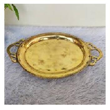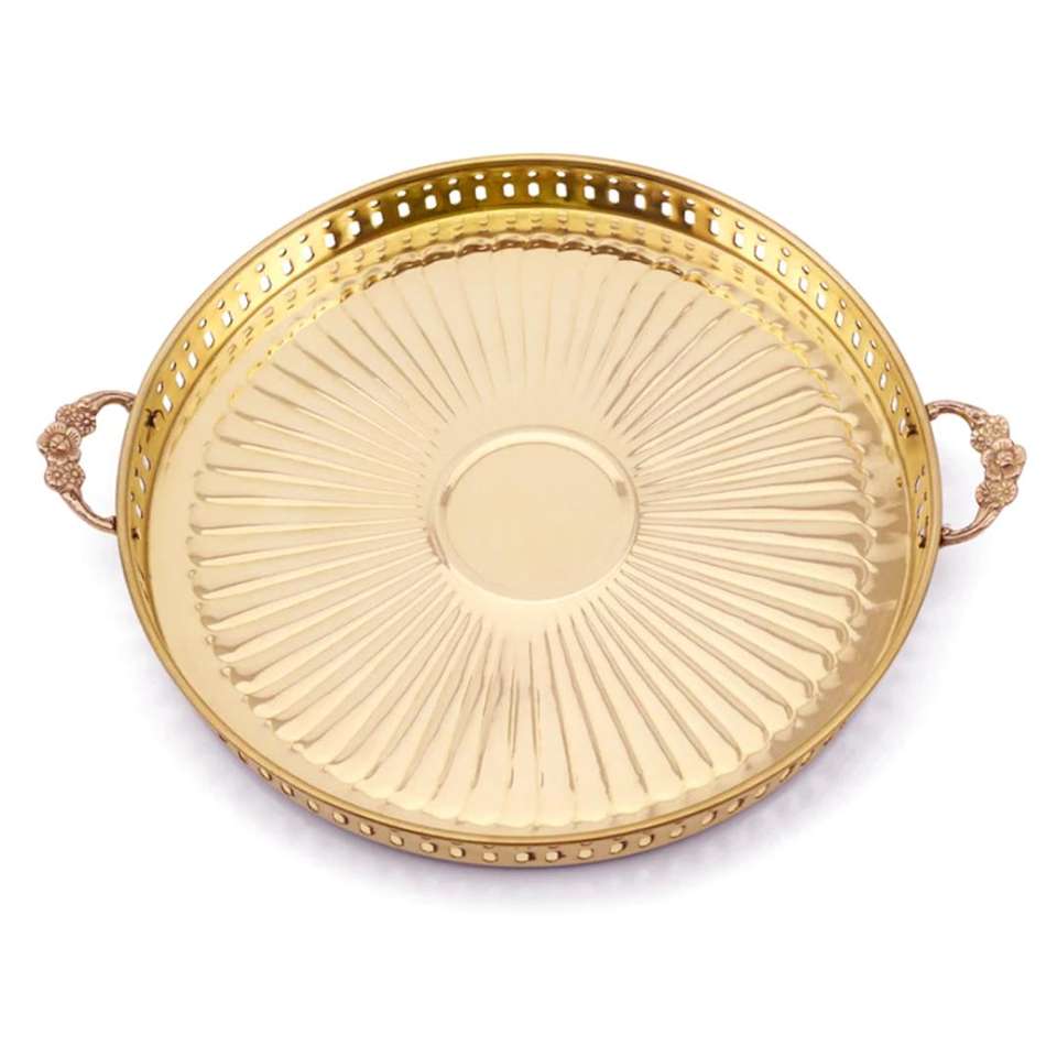 ถาดเสิร์ฟโลหะทองเหลืองพร้อมที่จับอุปกรณ์บนโต๊ะอาหารทรงกลมขนาดพิเศษสำหรับตกแต่งโรงแรมและร้านอาหาร