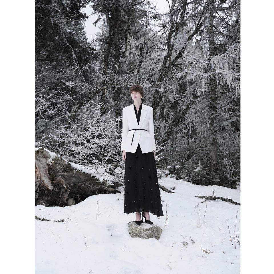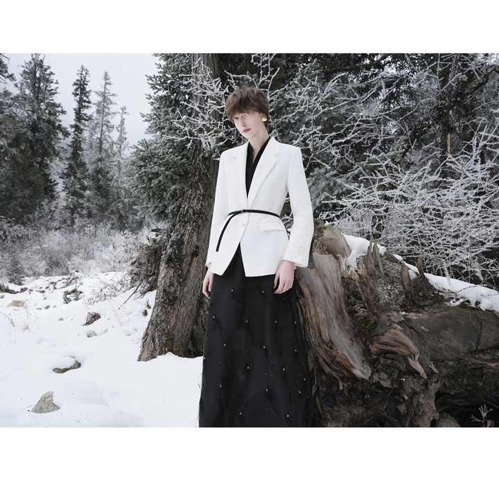 เสื้อเบลเซอร์ผู้หญิงรุ่นใหม่สุดหรู ODILE แบบสองชั้นที่คอเสื้อ ผ้าเนื้อหนา 650 กรัม แขนยาว พร้อมเข็มขัดประณีต สีขาว WhiteAnt