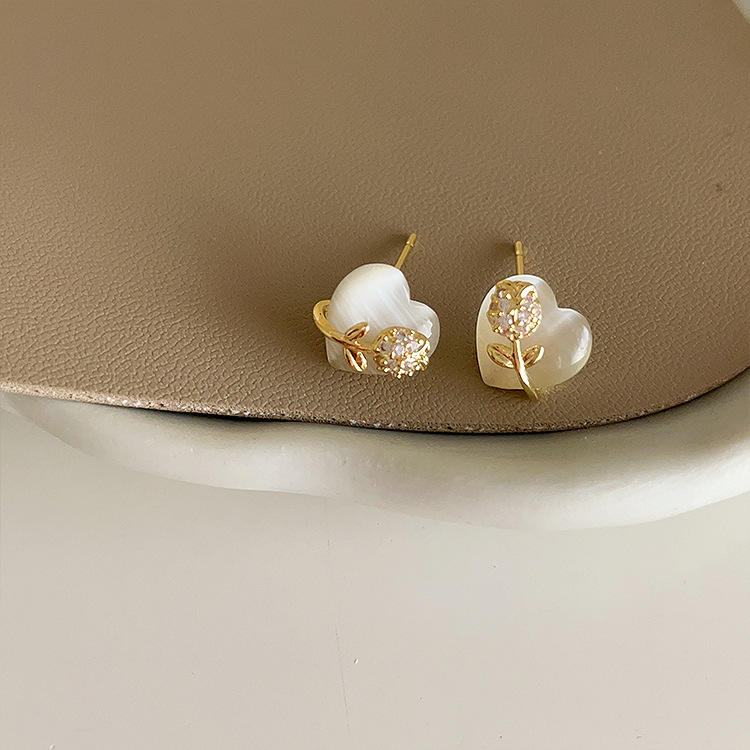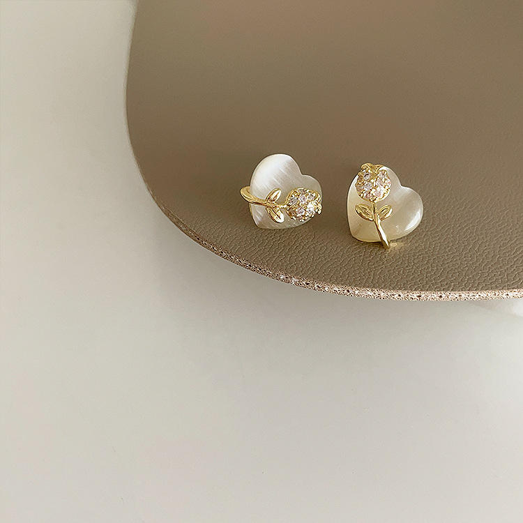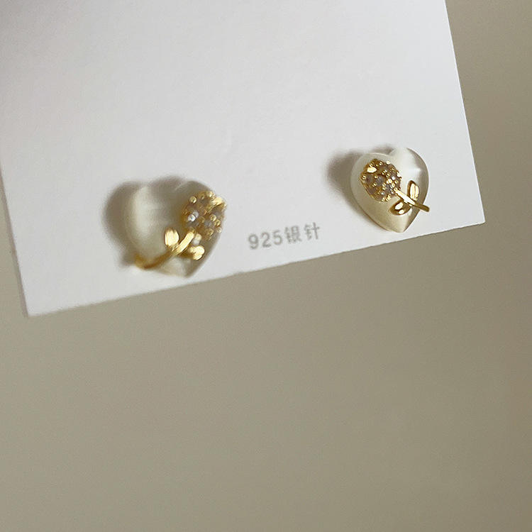 ต่างหูสตั๊ดรูปดอกไม้เซอร์โคเนียอันปราณีตใหม่ต่างหูหินรูปหัวใจรูปแมวต่างหูทอง