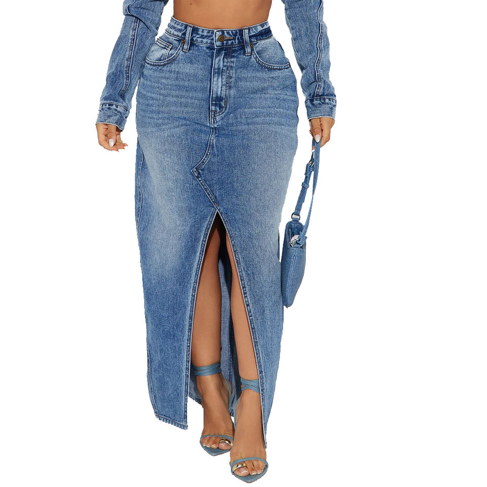 New Trendy Fashionable 5 Pockets Front Slit Casual Denim Maxi Skirt / Wholesale High Waist Women Medium Wash Custom Denim Skirt