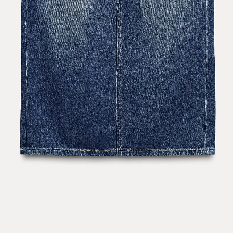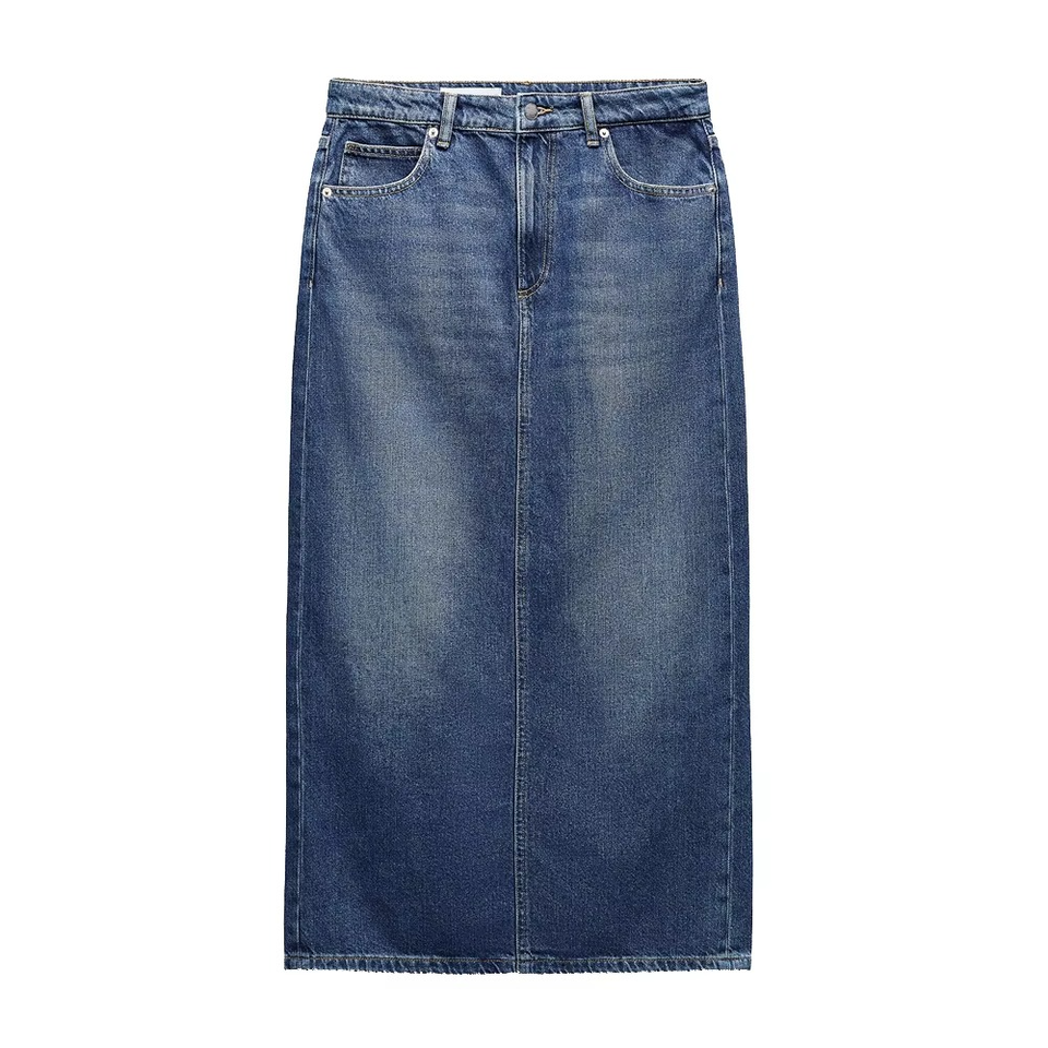 กระโปรงยีนส์สีน้ำเงินคลาสสิกทรงตรงเอวกลาง แฟชั่นใหม่ทันสมัยสำหรับผู้หญิง ราคาขายส่ง