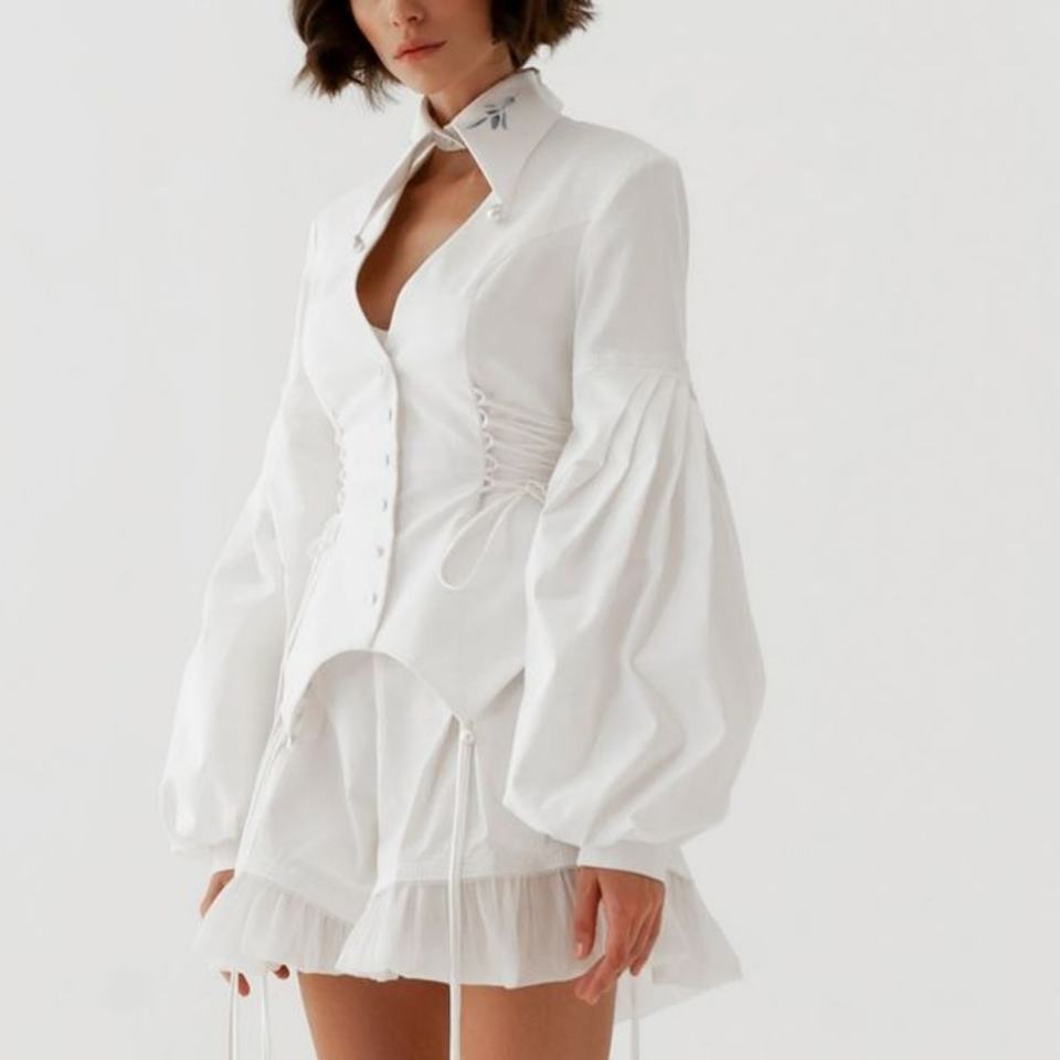 New Trendy Fashionable Polo Shirts Hollow Cotton Blouse Long Puff Sleeve Loose Tops White Shirt Women
