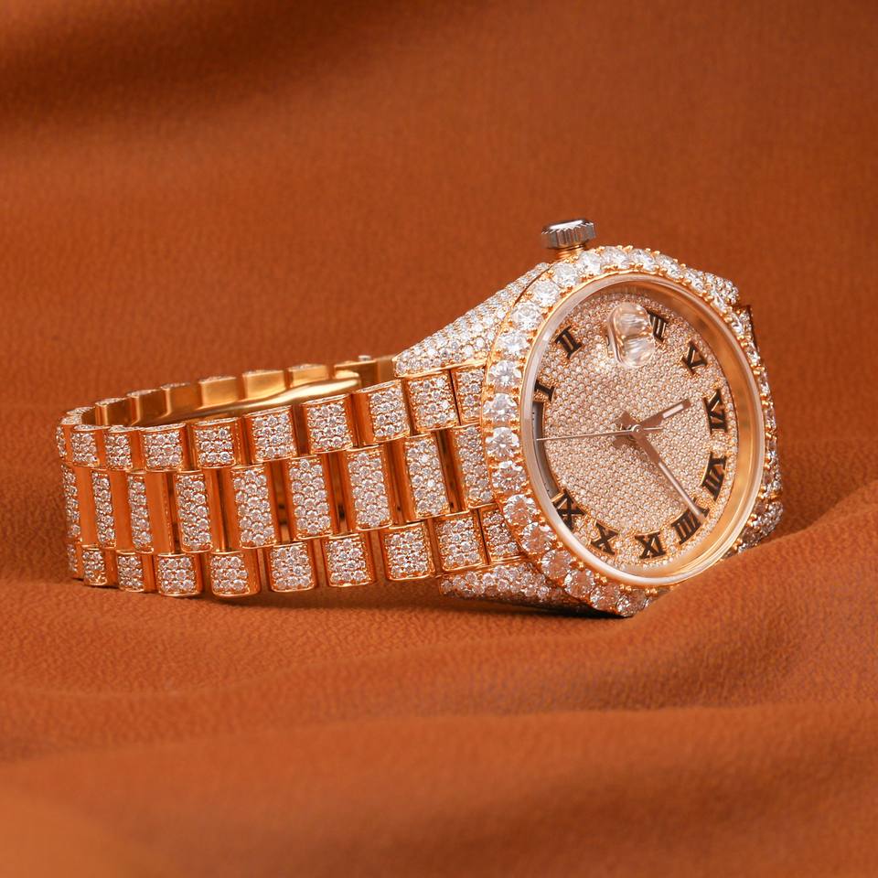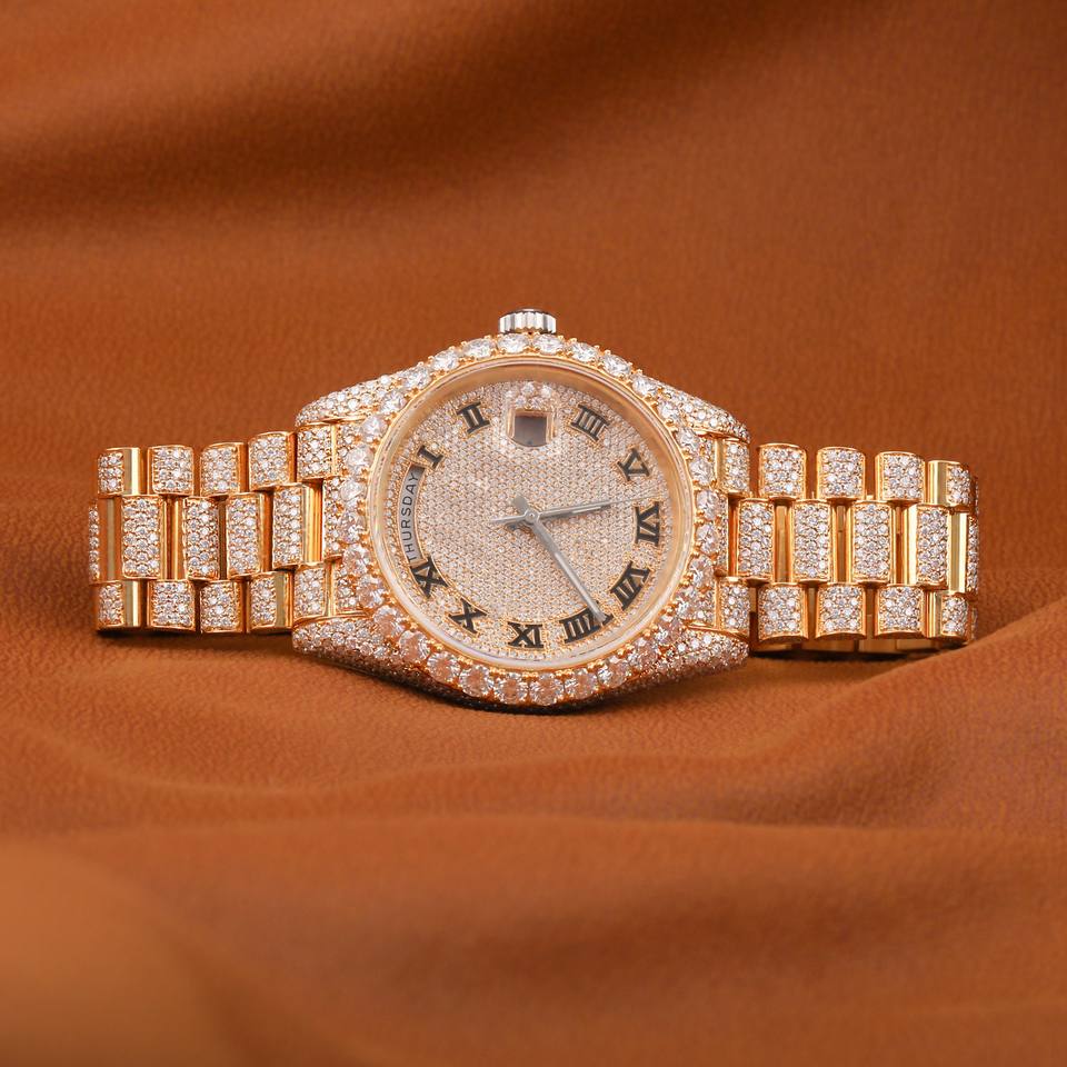 นาฬิกาเพชรโมอิสทำมือหมุนกระจกหมุนอัตโนมัติหน้าปัดกระจกหน้าต่างแบบแอนะล็อกสไตล์ฮิปฮอป