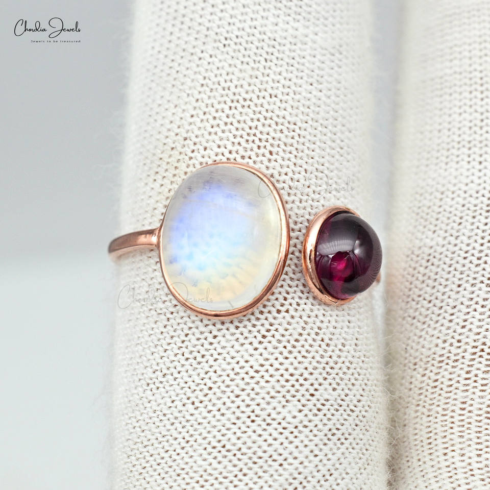 ใหม่อินเทรนด์Rainbow Moonstoneแหวนธรรมชาติ 6 มม.Rhodoliteโกเมนแหวนพลอย 14K Solid Rose Goldด้านหน้าเปิดแหวนผู้ค้าส่ง