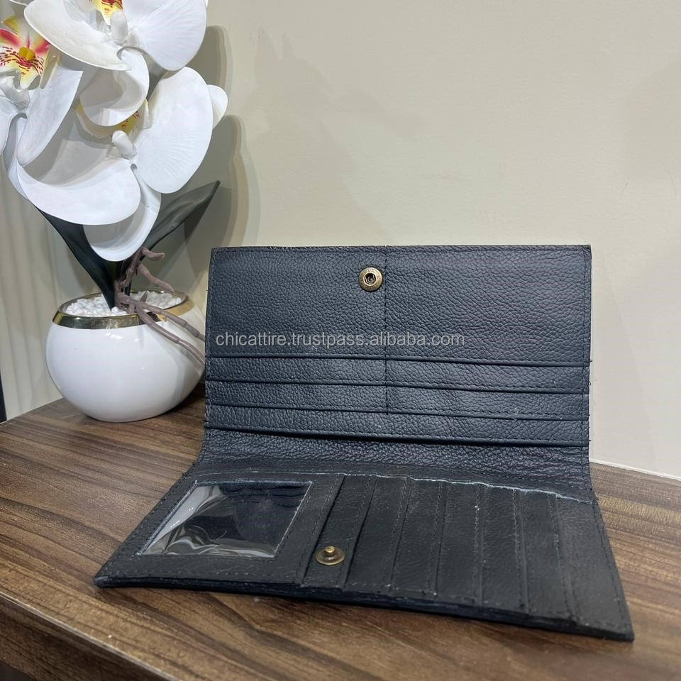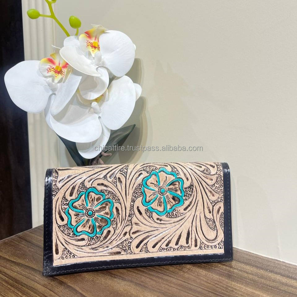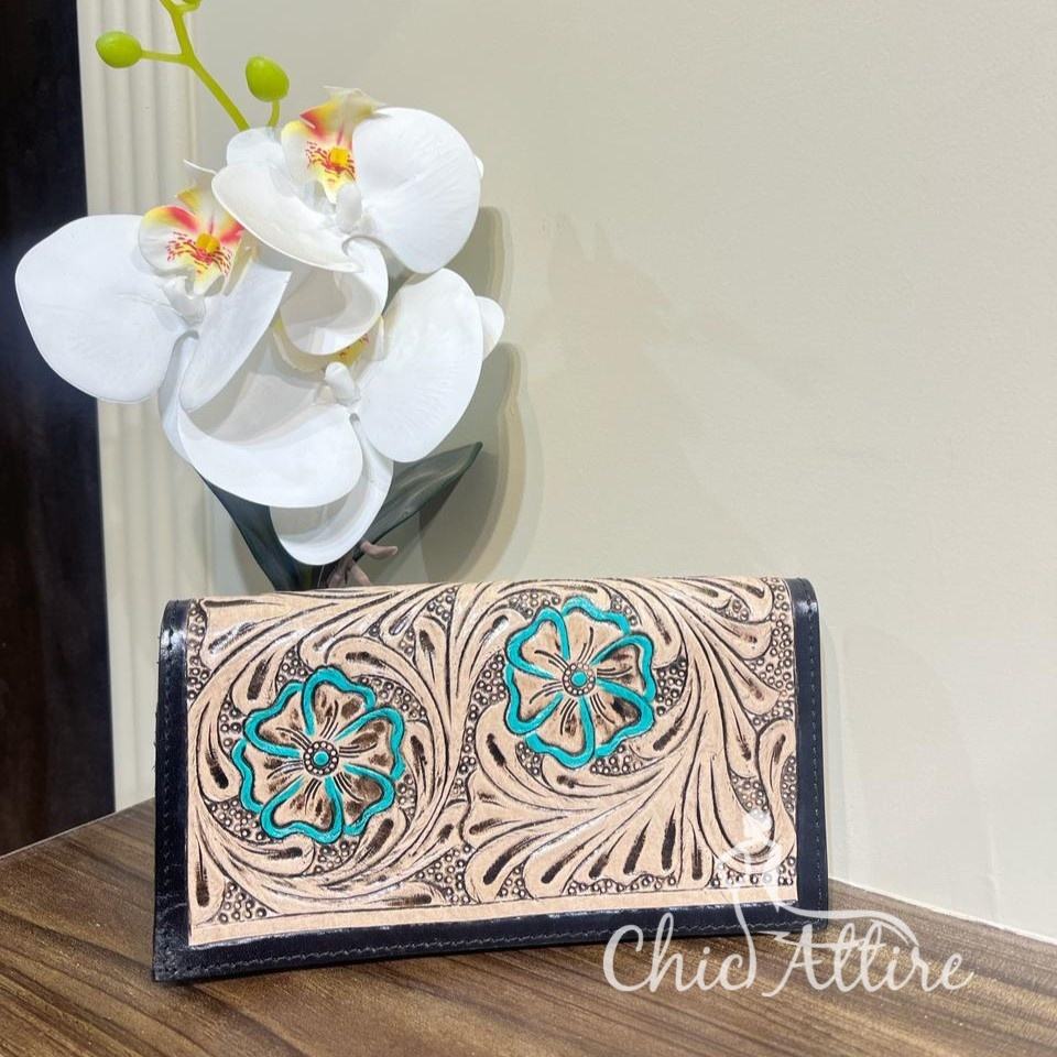 กระเป๋าสตางค์หนังแท้สำหรับผู้หญิงกระเป๋าสตางค์พับได้ลายดอกไม้ทำจากหนังเทอร์ควอยซ์