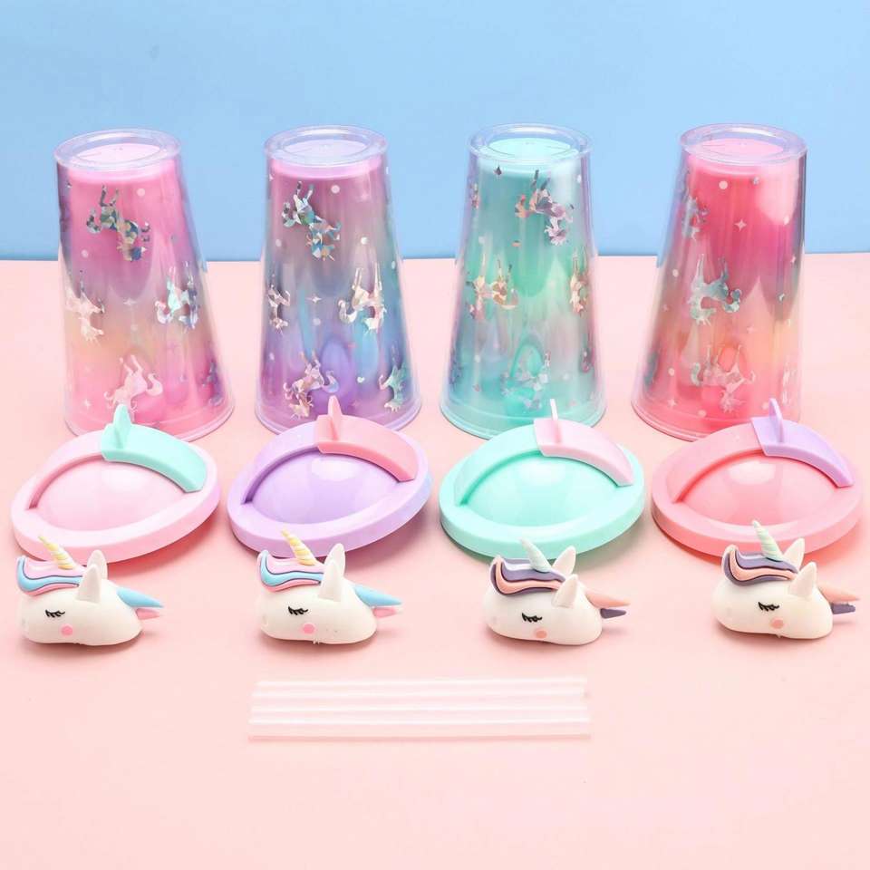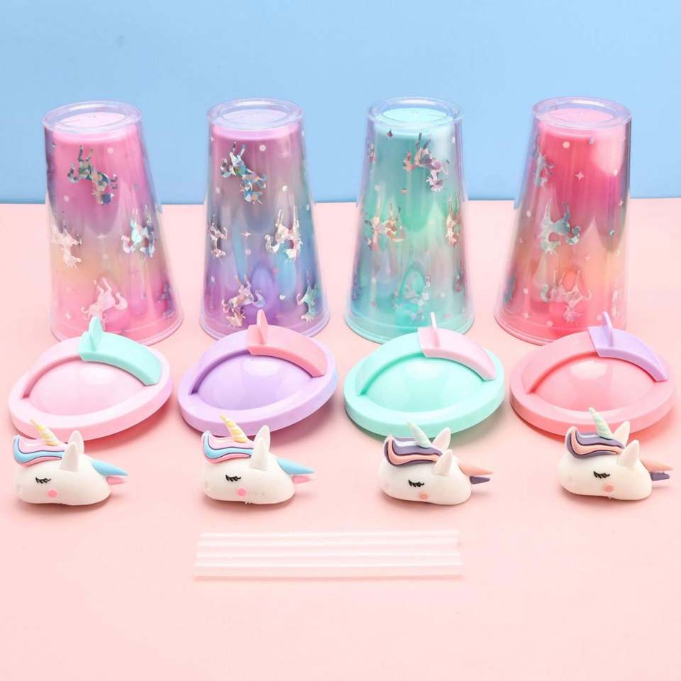 ขวดน้ำพลาสติกลายยูนิคอร์นน่ารัก พร้อมหลอดดูดตรงสำหรับแคมป์ปิ้ง
