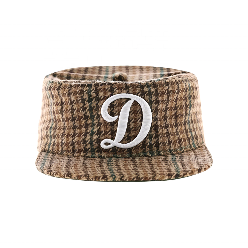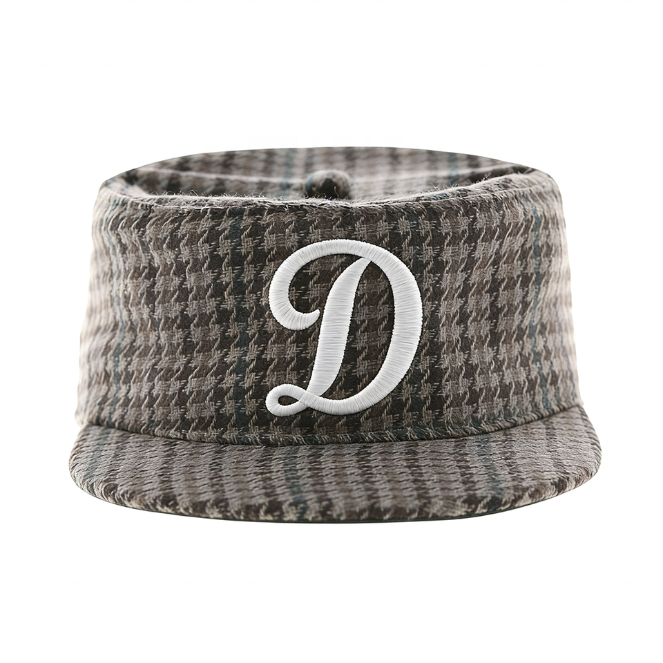 หมวกทรงพิลบอกซ์ผ้าวูลผสมลายฮาวด์ทูธแบบใหม่ ปักโลโก้ 3 มิติ ปีกแบนปรับได้ สไตล์ลำลองสำหรับใส่เดินเล่น