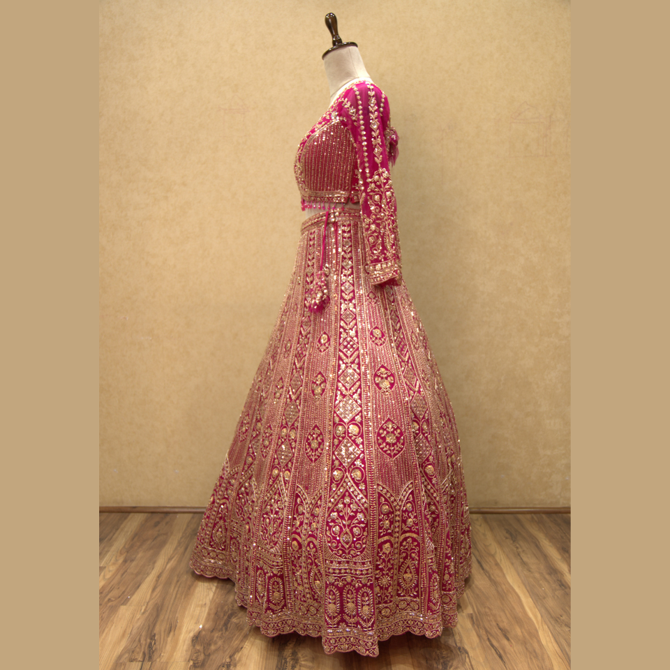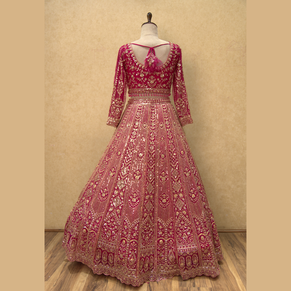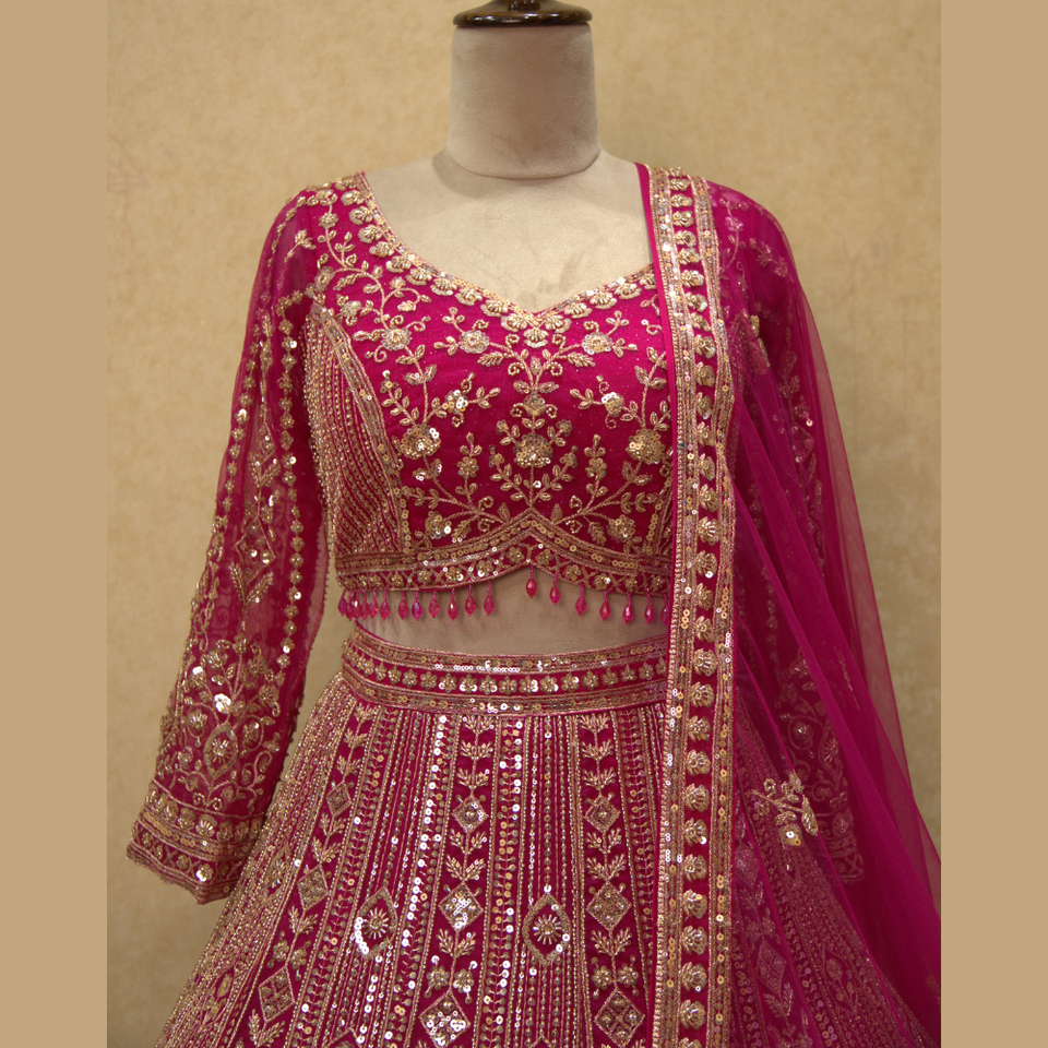 ชุดเลเฮนกาสีชมพูสดใสแบบใหม่ ประดับด้วยเลื่อมวิบวับและงานปักมืออย่างประณีต เหมาะสำหรับทุกโอกาสจากอินเดีย