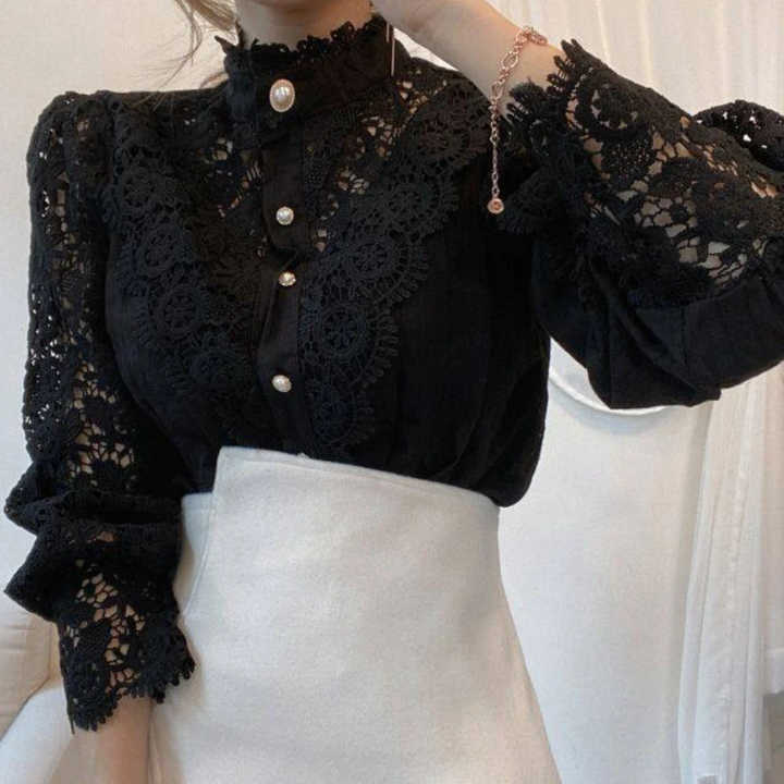 New Vintage White Lace Blouse Shirts Women 2024 Korean Button Loose Shirt Tops Female Hollow Casual Ladies Blouses Blusas