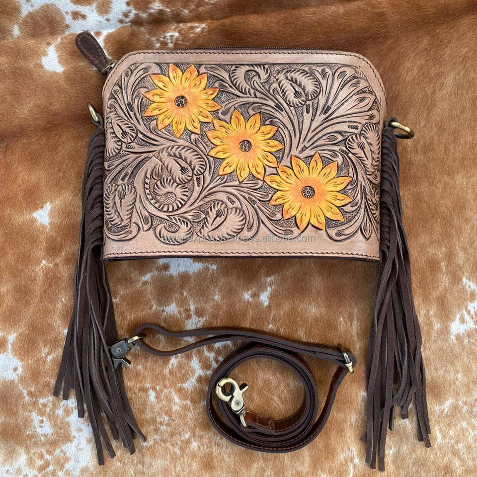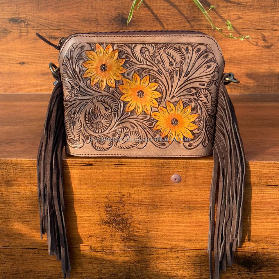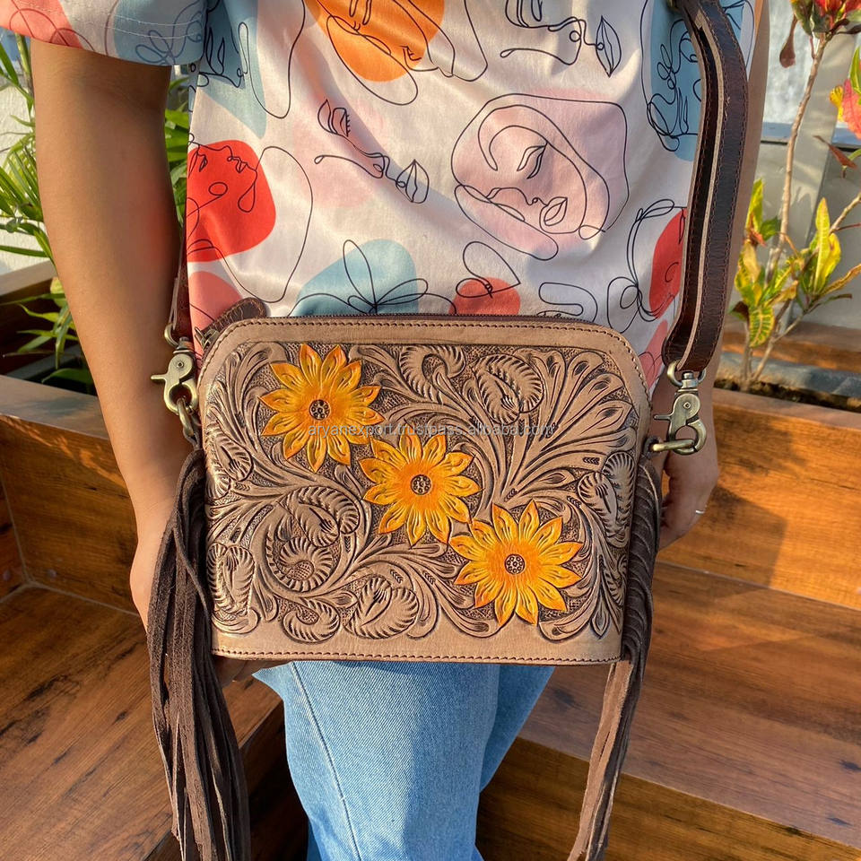 ชื่อผลิตภัณฑ์:กระเป๋าสะพายพาดลำตัวหนังดอกทานตะวันทำมือ