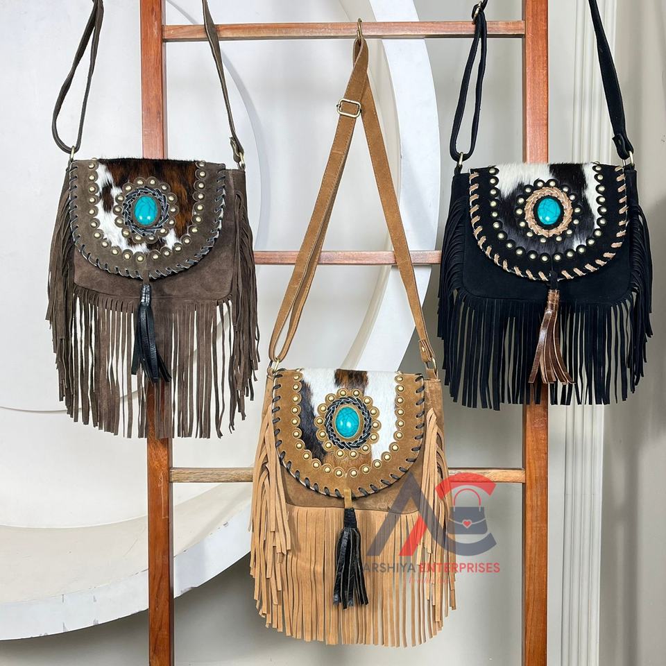 กระเป๋าหนังกลับขนสัตว์สไตล์ตะวันตกแบบใหม่ กระเป๋าสะพายไหล่หนังแท้คุณภาพสูงสำหรับผู้หญิงสไตล์โบฮีเมียน ประดับด้วยหินเทอร์ควอยซ์