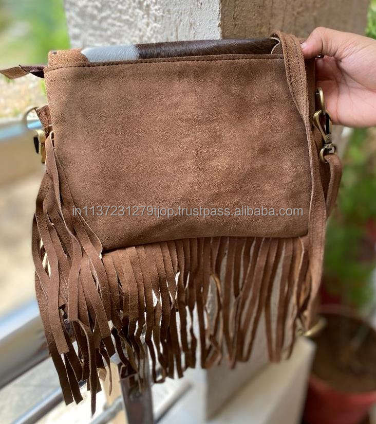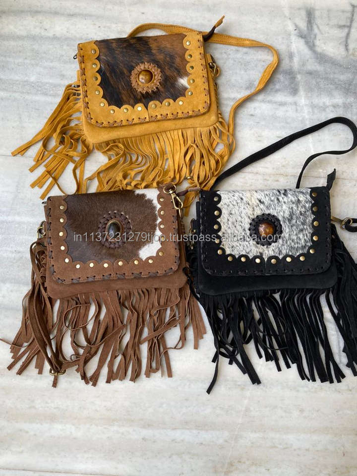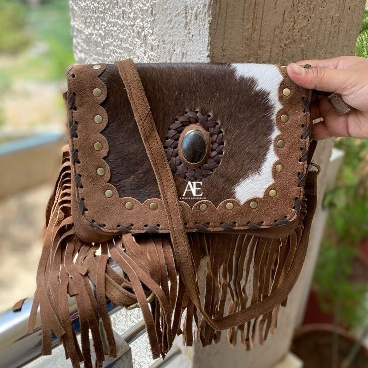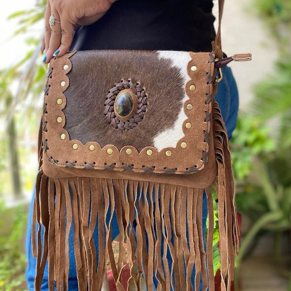 กระเป๋าสะพายไหล่หนังกลับขนสไตล์ตะวันตกสำหรับผู้หญิงพร้อมหินเทอร์ควอยซ์