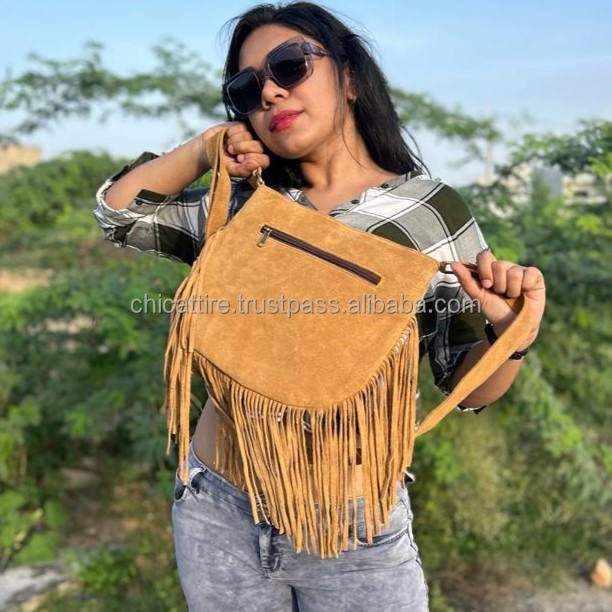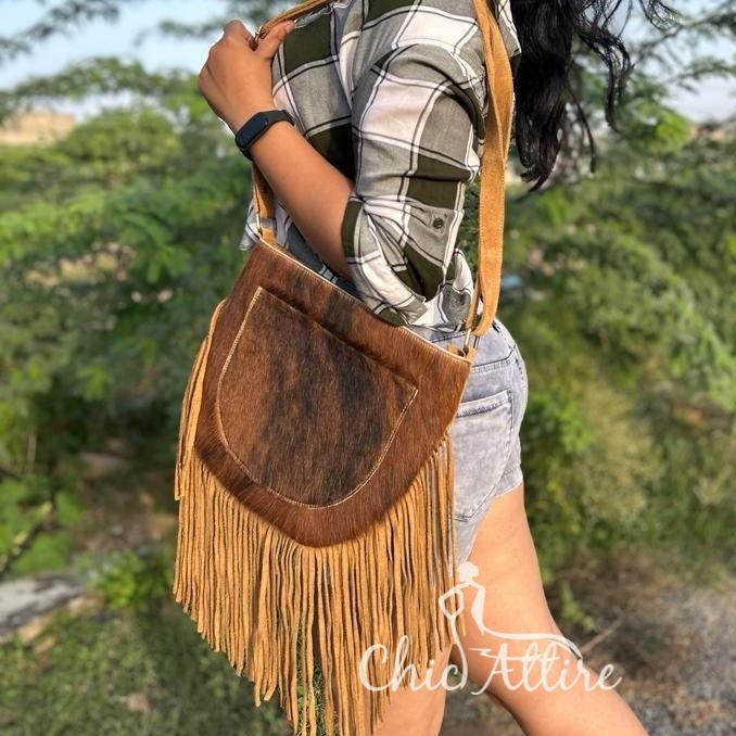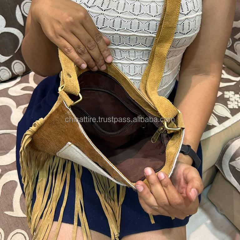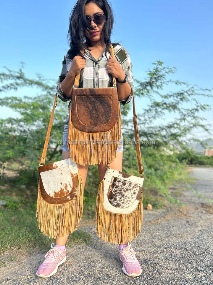 กระเป๋าสะพายพาดลำตัวหนังแท้สำหรับผู้หญิงหนังแท้ขนแกะสไตล์โบโฮใหม่