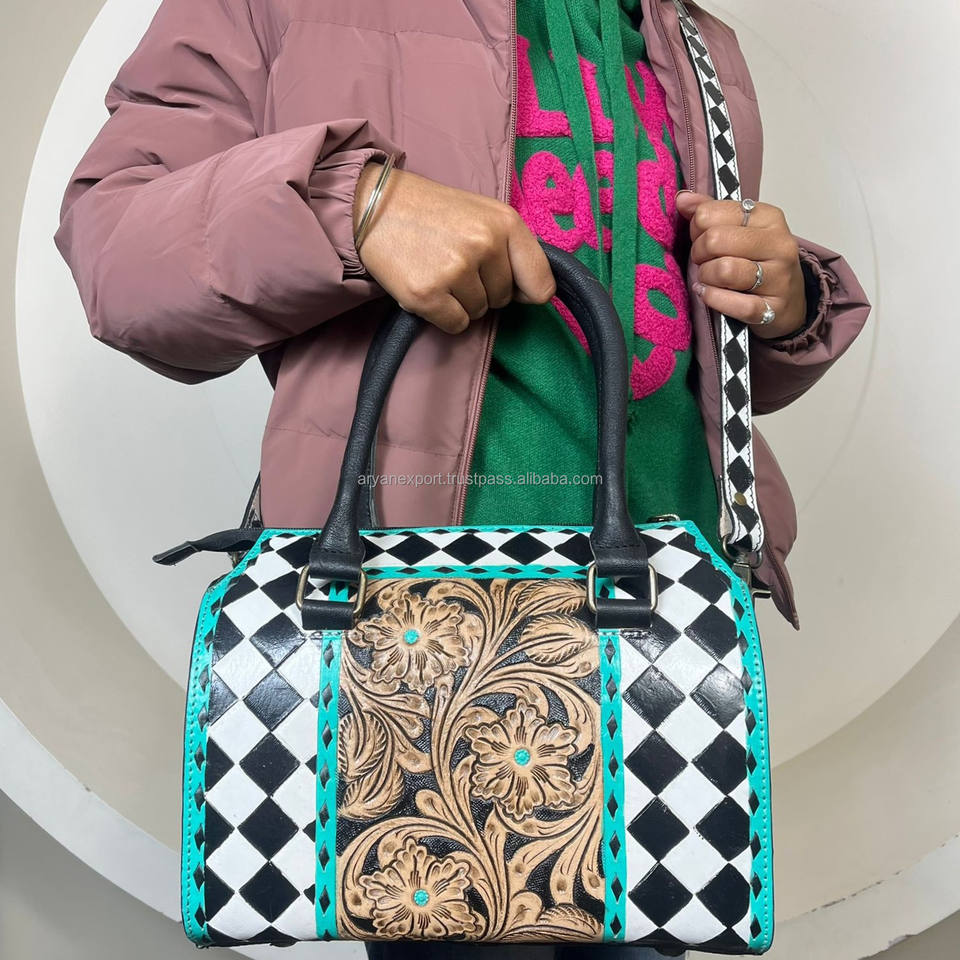 New Western Style Medium Black & White Checkered Speedy Bag for Women's Hand Tooled Leather Duffel Bag Cowhide Crossbody Handbag