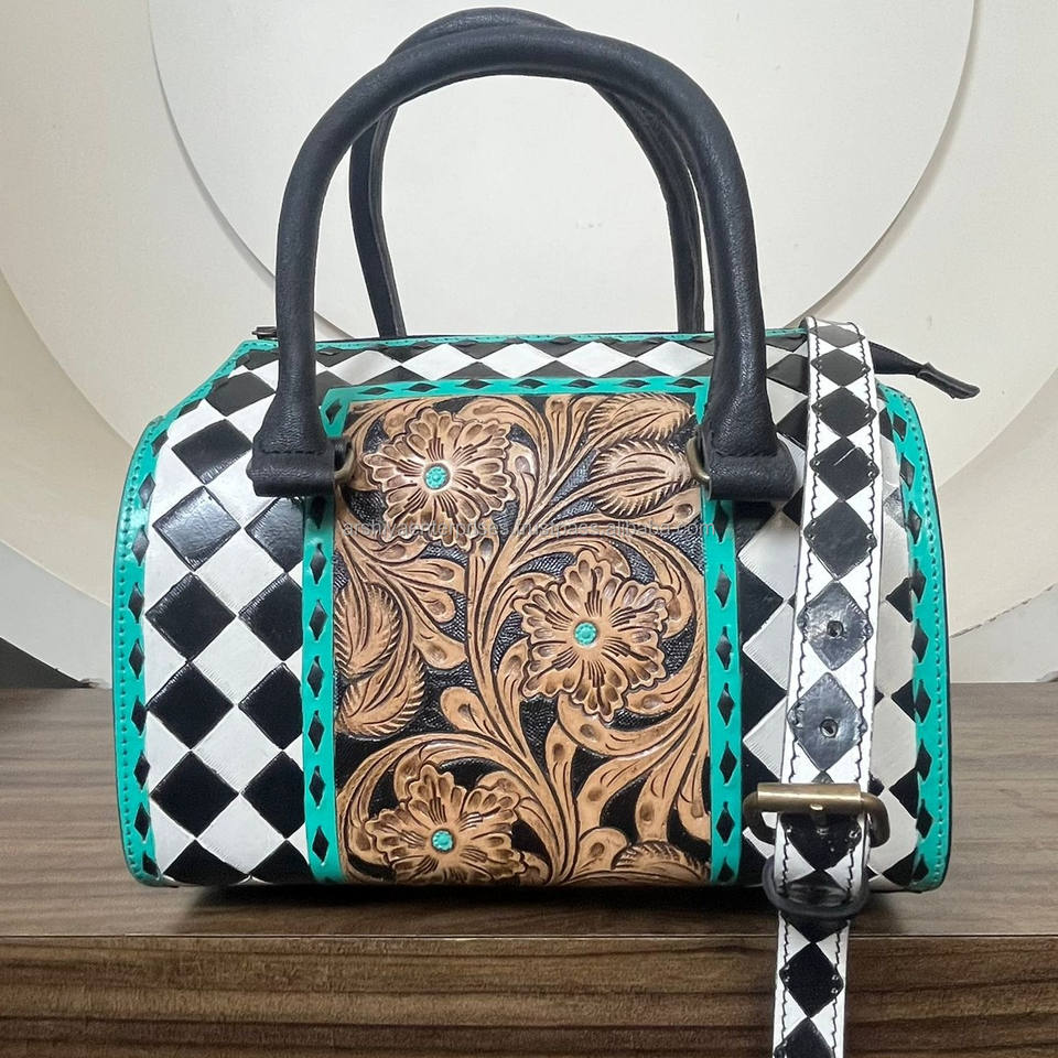 กระเป๋าสะพายไหล่หนังวัวลายตารางหมากรุกสีดำขาวสไตล์ตะวันตกแบบใหม่สำหรับผู้หญิง กระเป๋าหนังแท้เย็บมือ