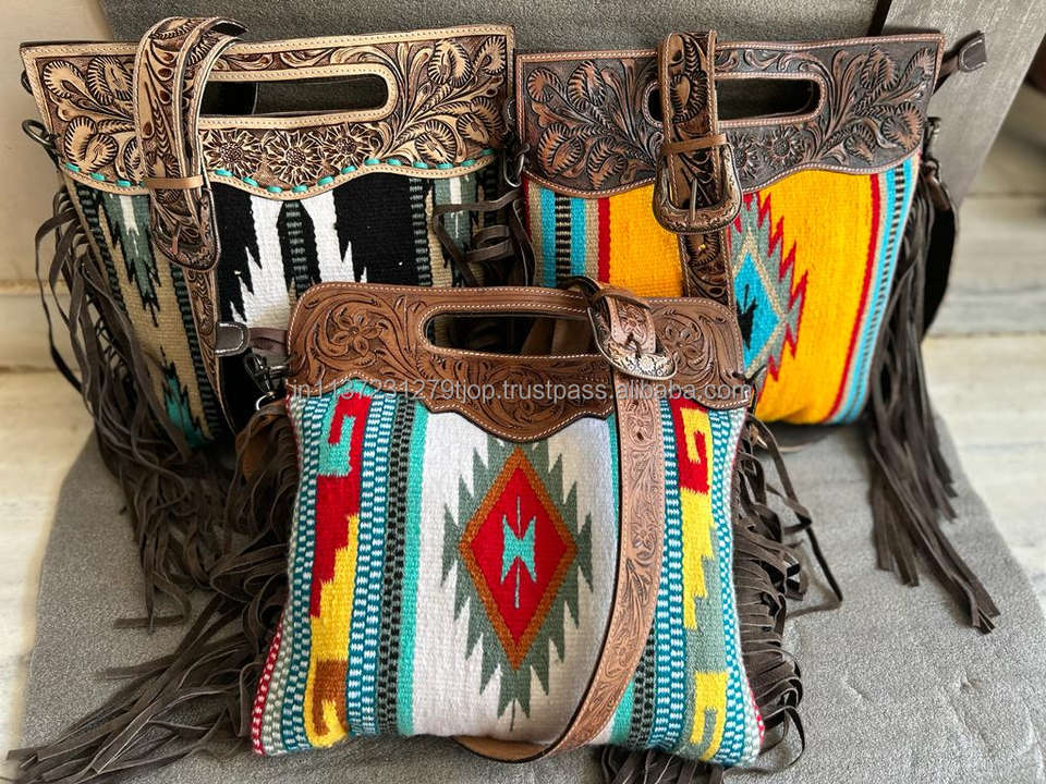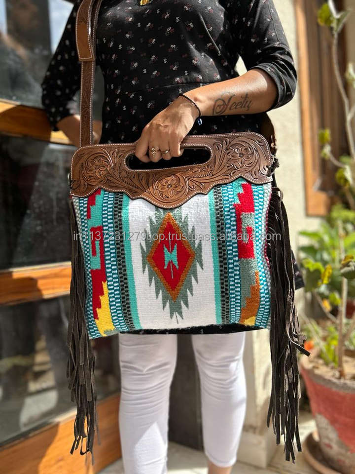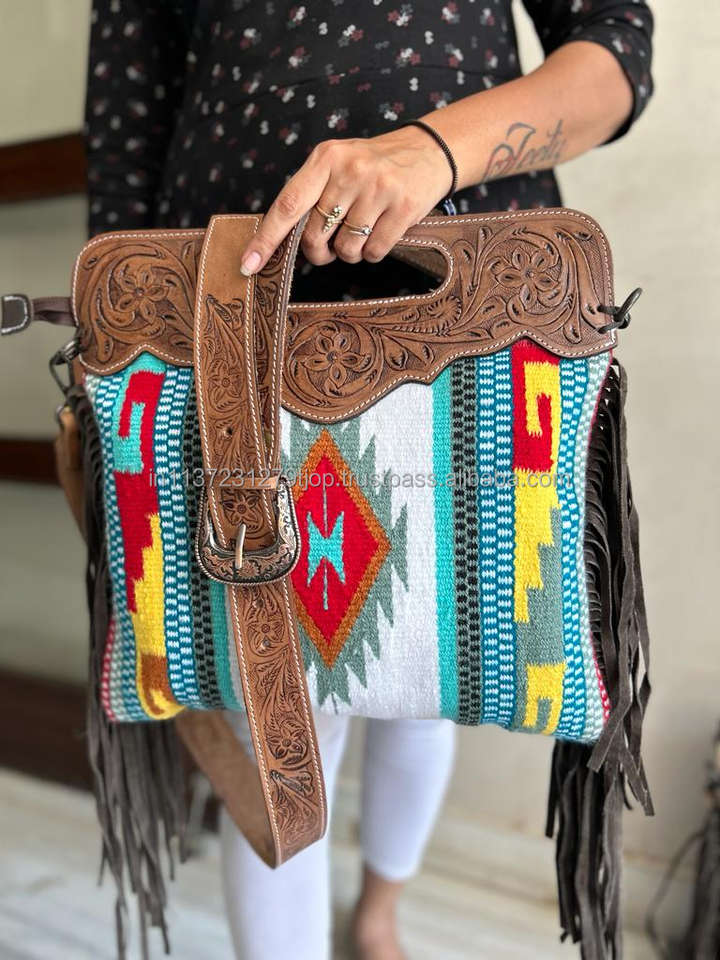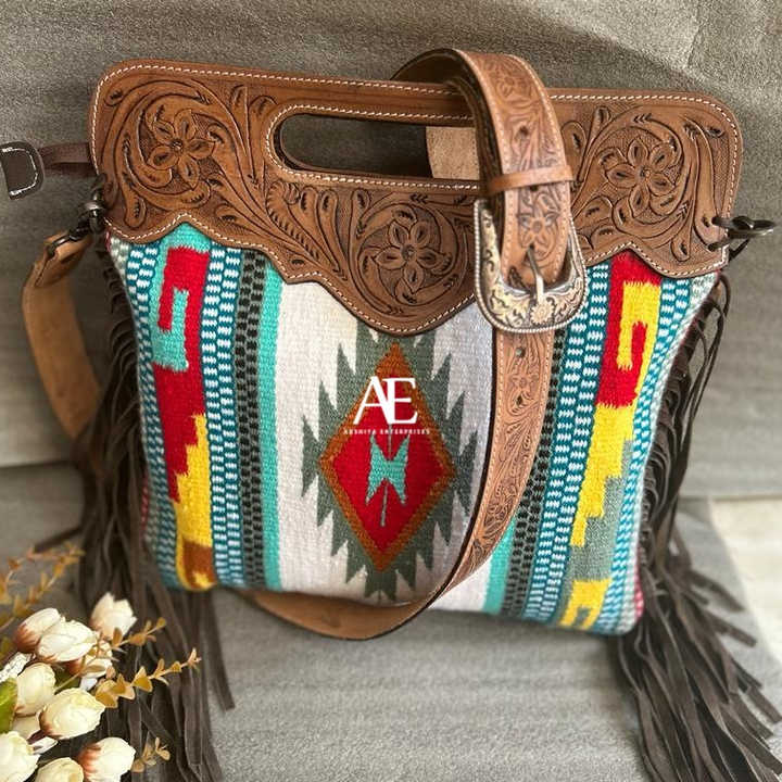 Western Stylish Saddle Blanket Handbag Handcrafted Tooled Strap Aztec Leather Crossbody Bag Vintage Multi Color Top Handle Bag