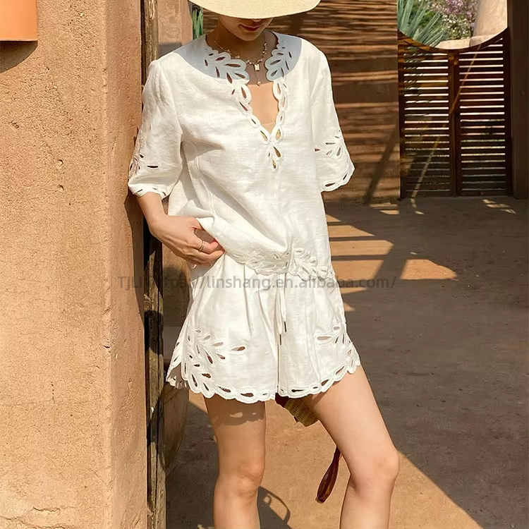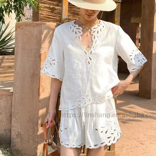 New White Cotton Linen Short Sleeve V-Neck Top Shorts Women's Vacation Style Hollowed Out Ruffle 2 Piece Set Fashion