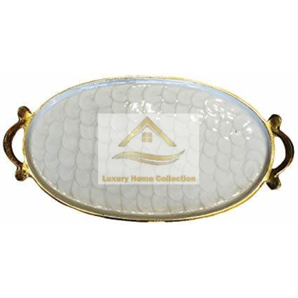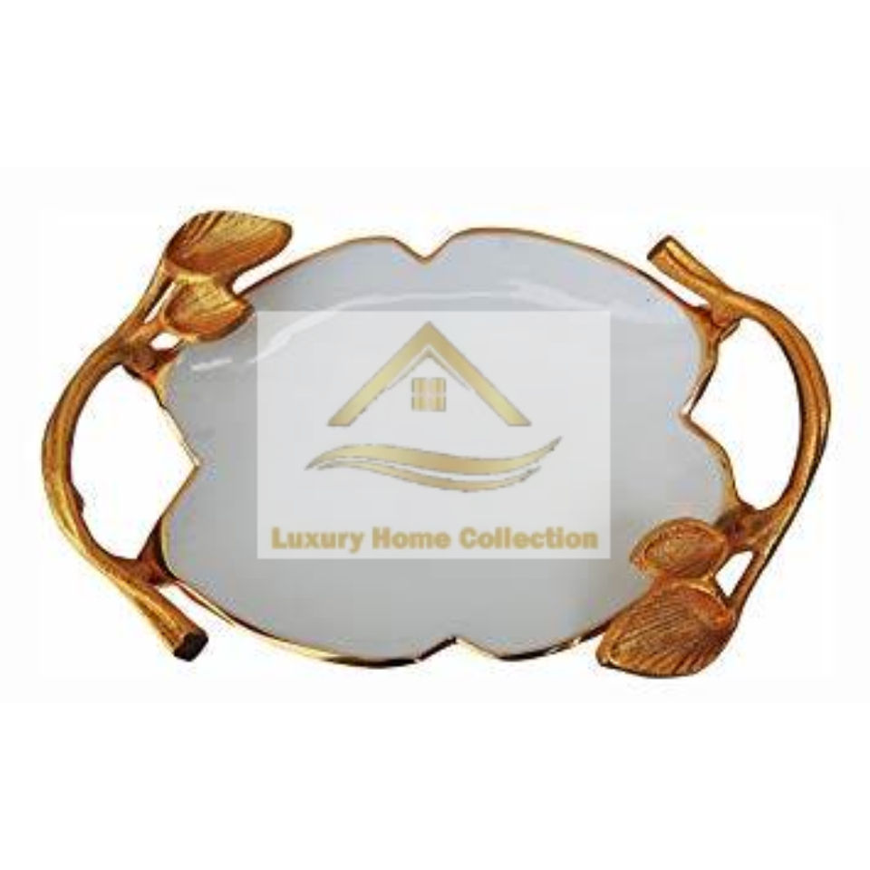 ถาดเคลือบสีขาวและสีทองพร้อมที่จับ2อันสำหรับเสิร์ฟขนมหวานและช็อคโกแลตถาดตกแต่ง