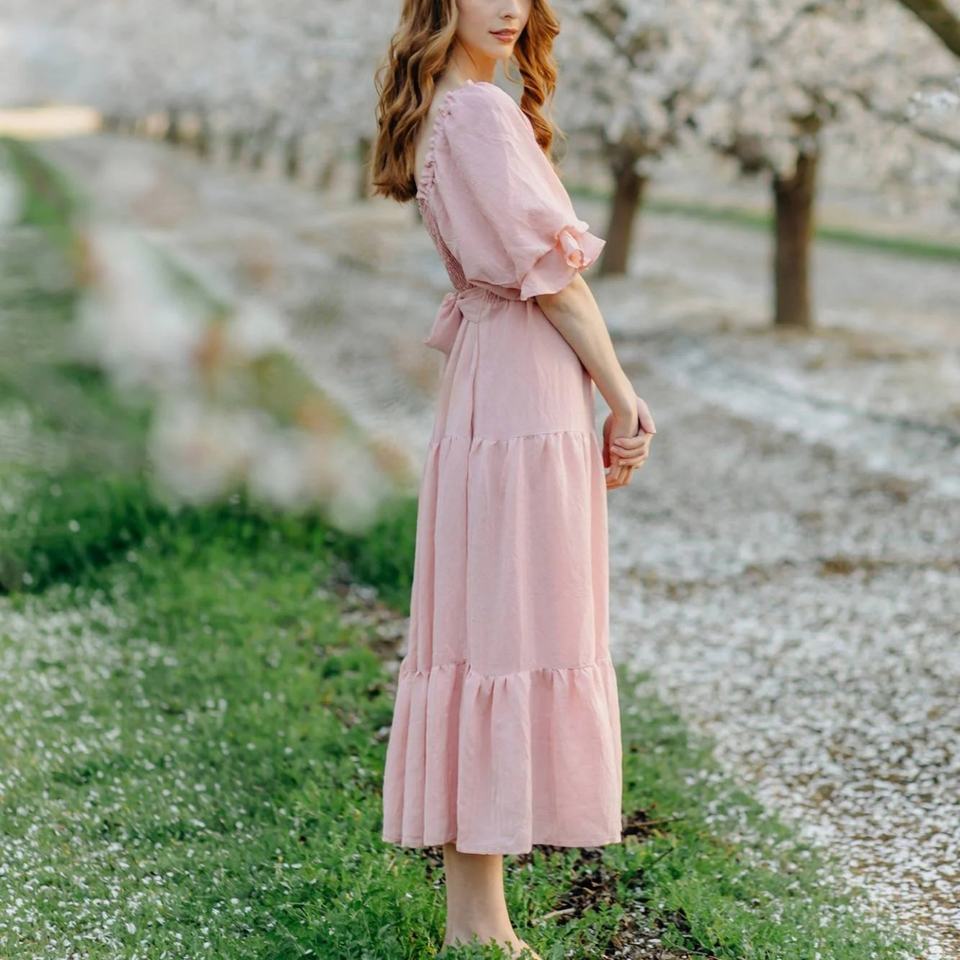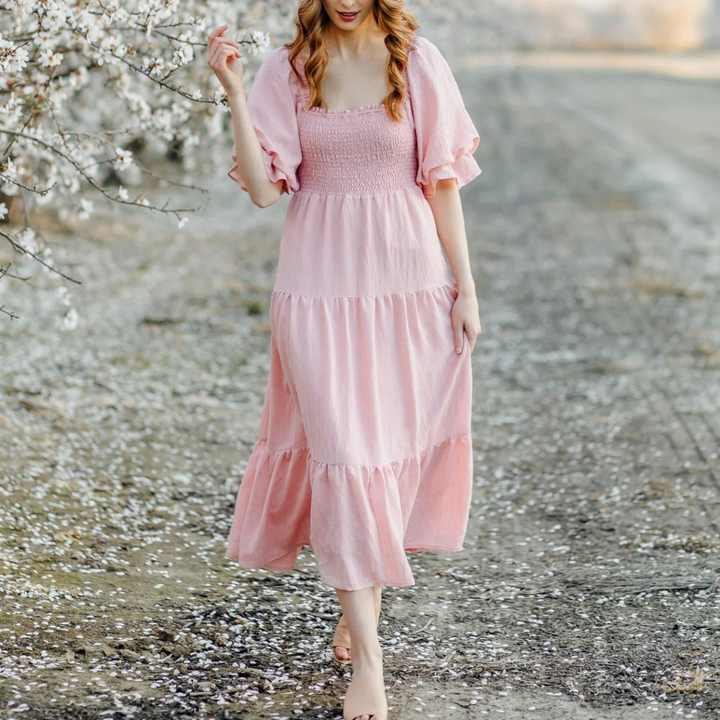 เดรสยาวลำลองน่ารักสไตล์ชายหาด แขนพอง คอเหลี่ยม ทรงเอไลน์ ผ้าพลิ้ว แต่งสม็อค ขายส่งแบบใหม่