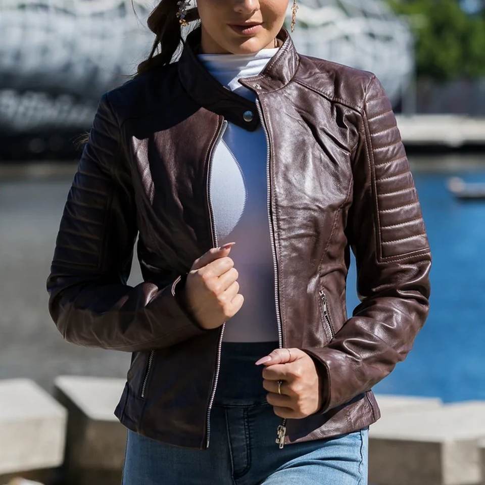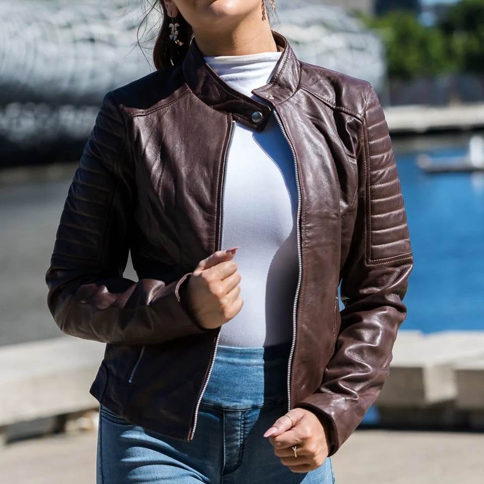 แจ็คเก็ตหนังแท้ทรงบอมเบอร์สไตล์วินเทจสำหรับผู้หญิง ซิปสีน้ำตาล รับผลิตตามสั่งพร้อมปักโลโก้ สำหรับฤดูหนาว สตรีทแวร์