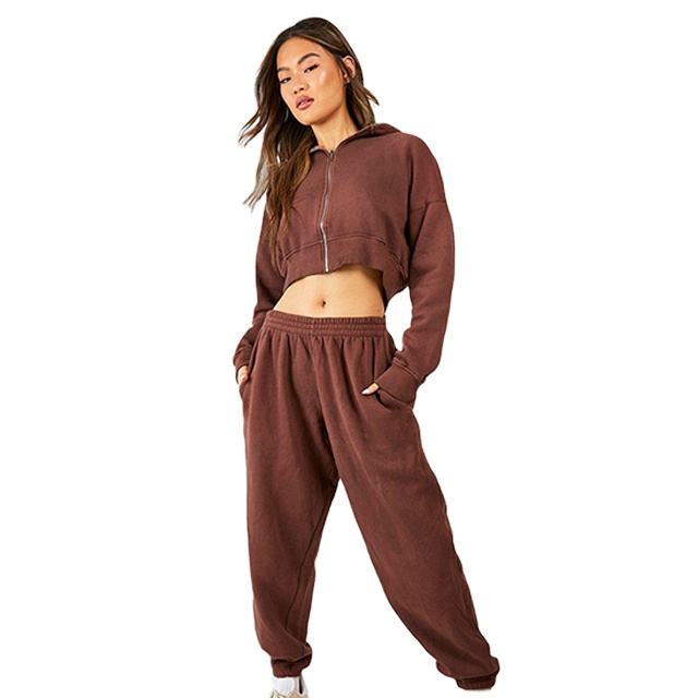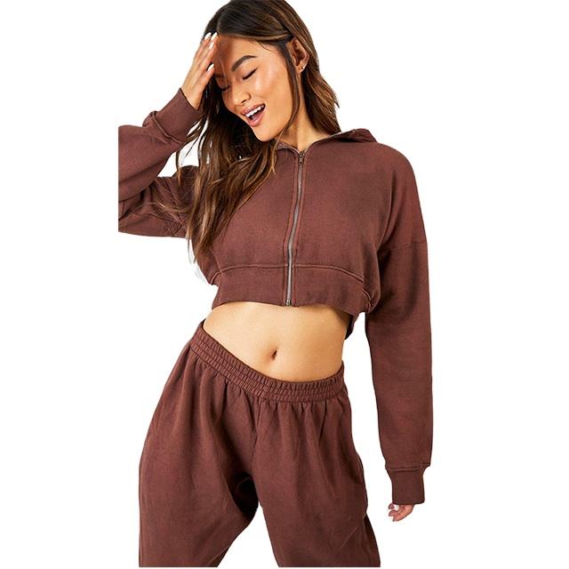 ชุดวอร์มผู้หญิงแบบ 2 ชิ้น คุณภาพสูง ขายส่งแบบใหม่ เนื้อผ้าหนา ทรงครอป ซิปยาวเต็มตัว ทรงปกติ เอวยางยืด สำหรับฤดูหนาว