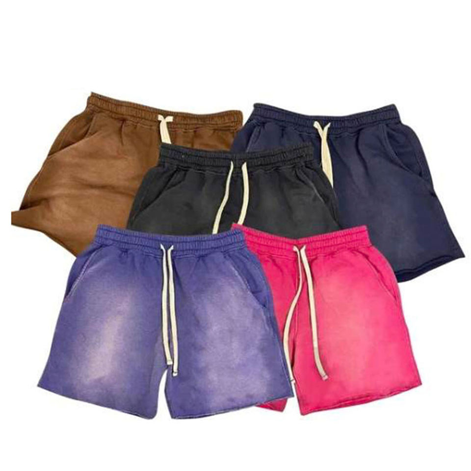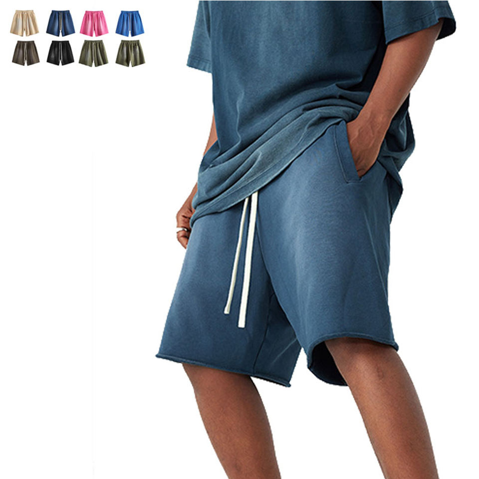กางเกงขาสั้นขายส่งฤดูร้อนแบบยูนิเซ็กซ์ ขายส่งกางเกงบาสเก็ตบอลผ้าฝ้ายเทอร์รี่ 100% สตรีทแวร์ ขอบดิบฟอกสี ล้างด้วยกรด สำหรับผู้ชาย