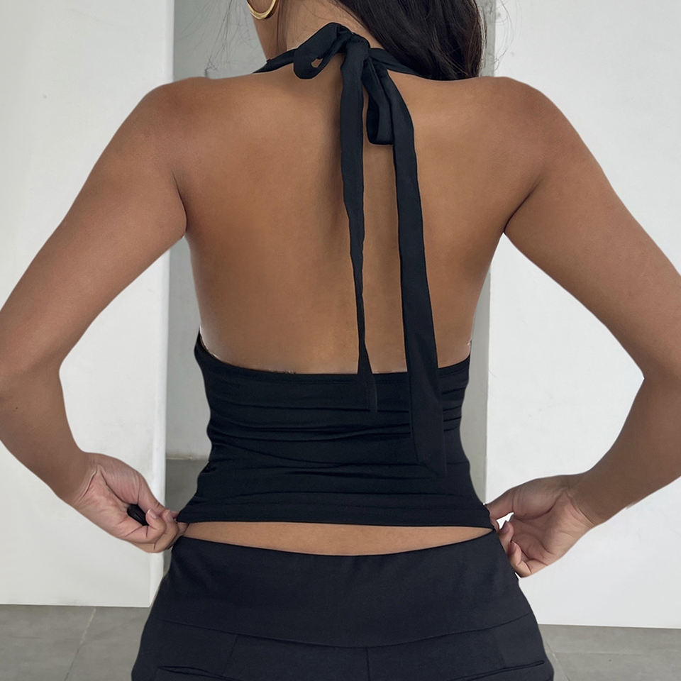 เสื้อสายเดี่ยวคอวีผูกหลังแบบเปิดหลัง แต่งผ้าลูกไม้สไตล์ Y2K สำหรับผู้หญิง ขายส่งแบบใหม่