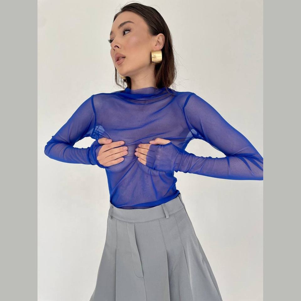 เสื้อตาข่ายขายส่งแบบใหม่ เสื้อเชิ้ตตาข่ายแขนยาว เนื้อผ้านุ่ม ยืดหยุ่น โปร่งใส เสื้อซีทรู ทรงเข้ารูป