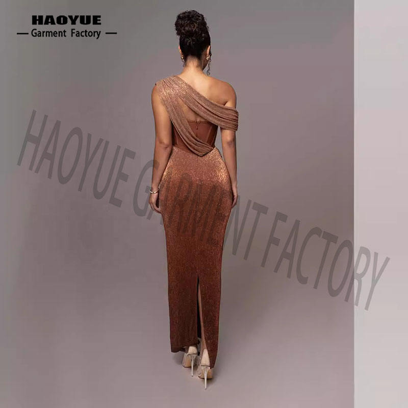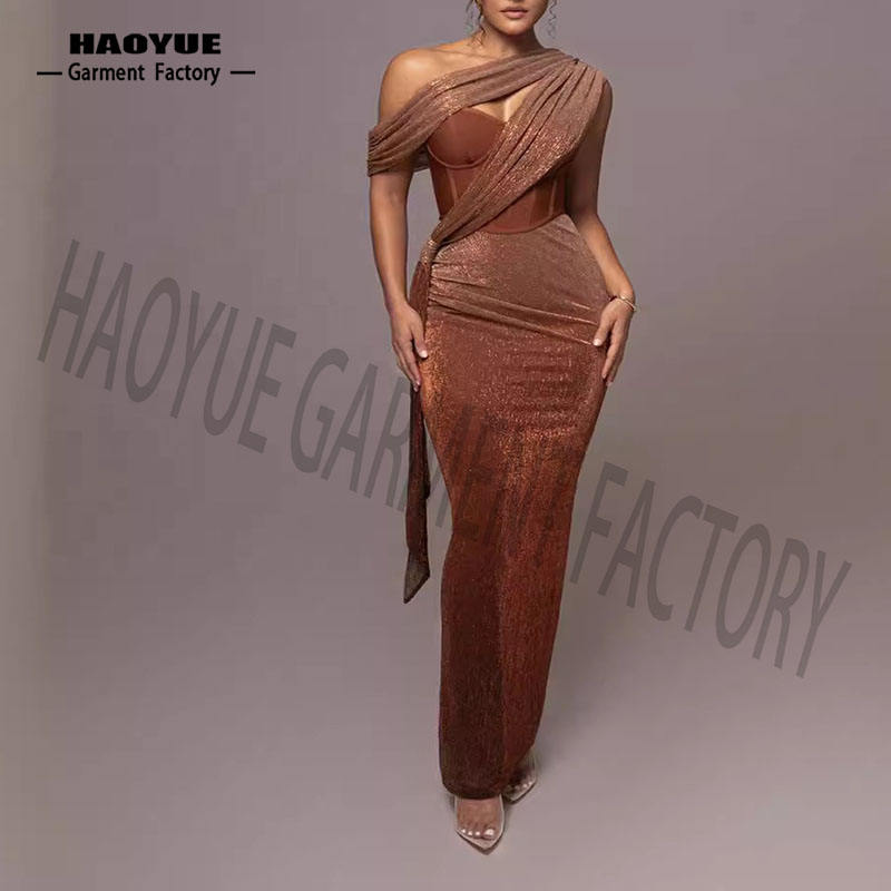 ชุดเดรสเซ็กซี่เปิดไหล่เฉียงสำหรับผู้หญิงเดรสเกาะอกสำหรับตอนเย็นเดรสสีน้ำตาลมีริบบิ้นเข้ารูปแฟชั่นใหม่