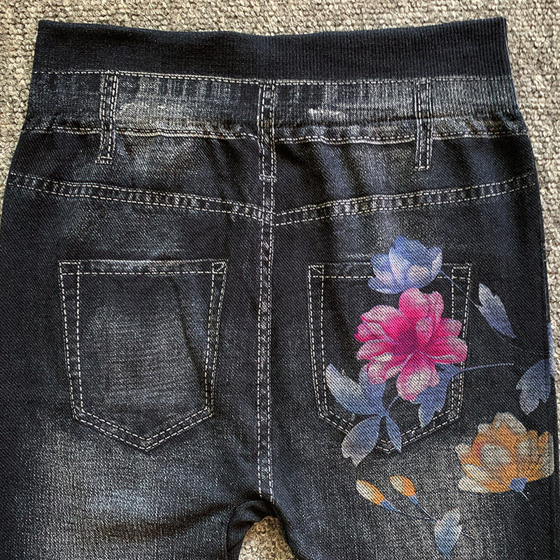 เลกกิ้งยกสะโพกผู้หญิงใหม่กางเกงยาวเข้ารูปพิมพ์ลายดอกไม้ยืดหยุ่นสูงเลกกิ้งยีนส์เลียนแบบไร้รอยต่อ