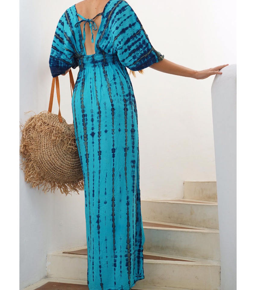 ชุดเดรสคาฟทันผ้าเรยอนลายมัดย้อมแต่งลูกไม้หรูหราสำหรับผู้หญิงแบบชิ้นเดียวพร้อมดีไซน์ผ่าข้าง