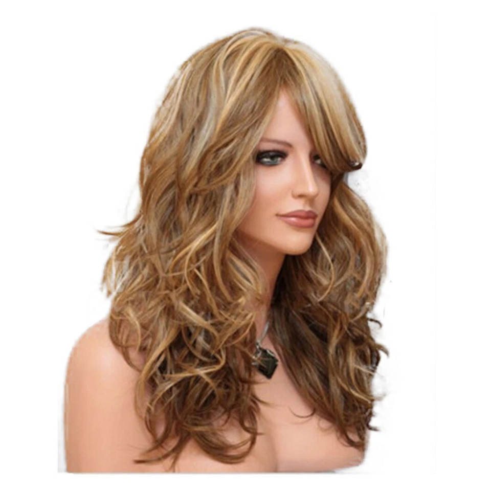 วิกผมผู้หญิงใหม่มีผมม้ายาวหยักศกสีบลอนด์พร้อมไฮไลท์สีแดงและสีดำผมสังเคราะห์ทนความร้อนสำหรับแฟชั่น