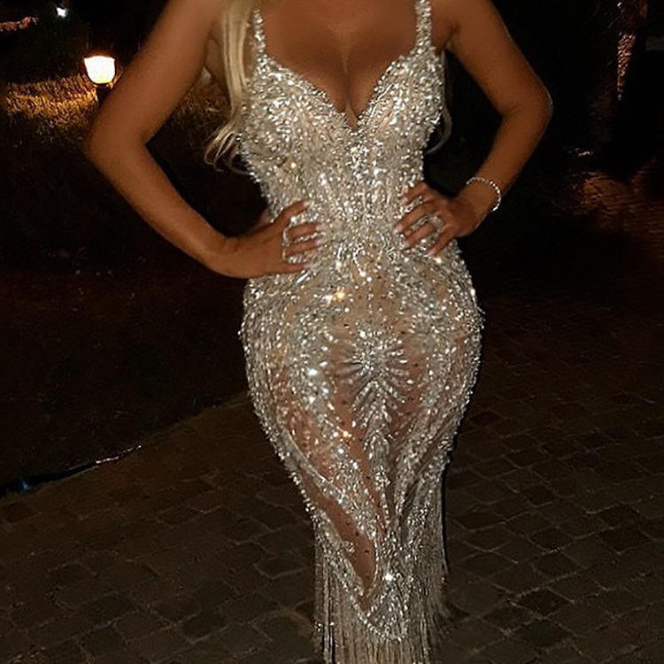ชุดเดรสผู้หญิงแฟชั่นแบบใหม่ คอวีลึก แต่งเลื่อมและพู่ห้อย