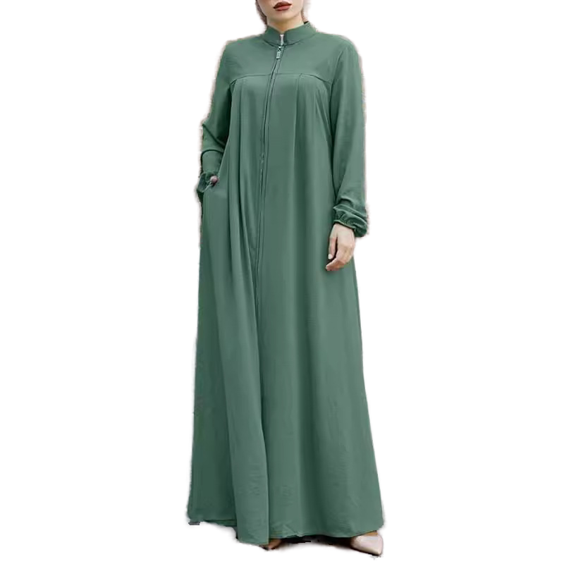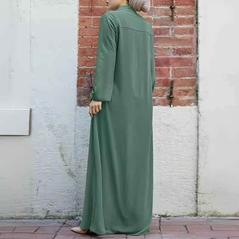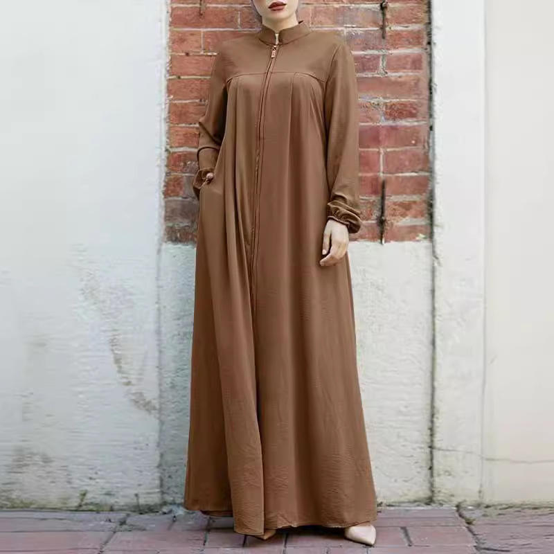 ชุดมุสลิมของผู้หญิงใหม่ชุดเดรสหรูหราทรงหลวมคอปกตั้งมีซิปกระเป๋าสไตล์อาหรับฤดูร้อนฤดูใบไม้ร่วงทำจากผ้าไหมโพลีเอสเตอร์
