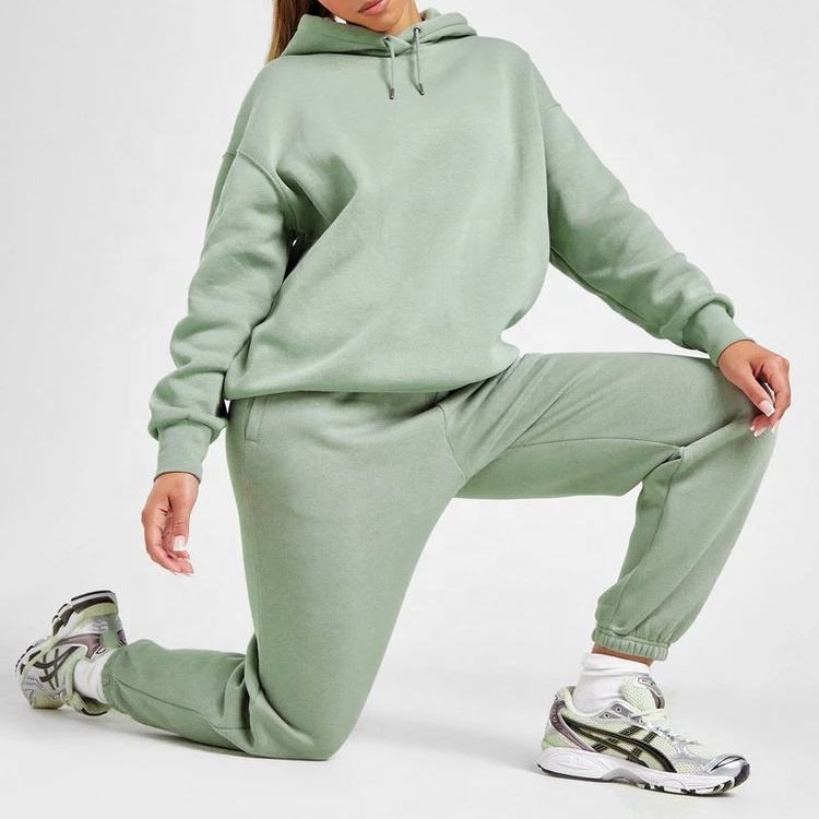 ใหม่ผู้หญิงสีเขียวมะกอกขนาดใหญ่ไหล่ 2 ชิ้น Kangaroo กระเป๋า Hoodie และ Jogger ชุดผ้าฝ้าย 100%