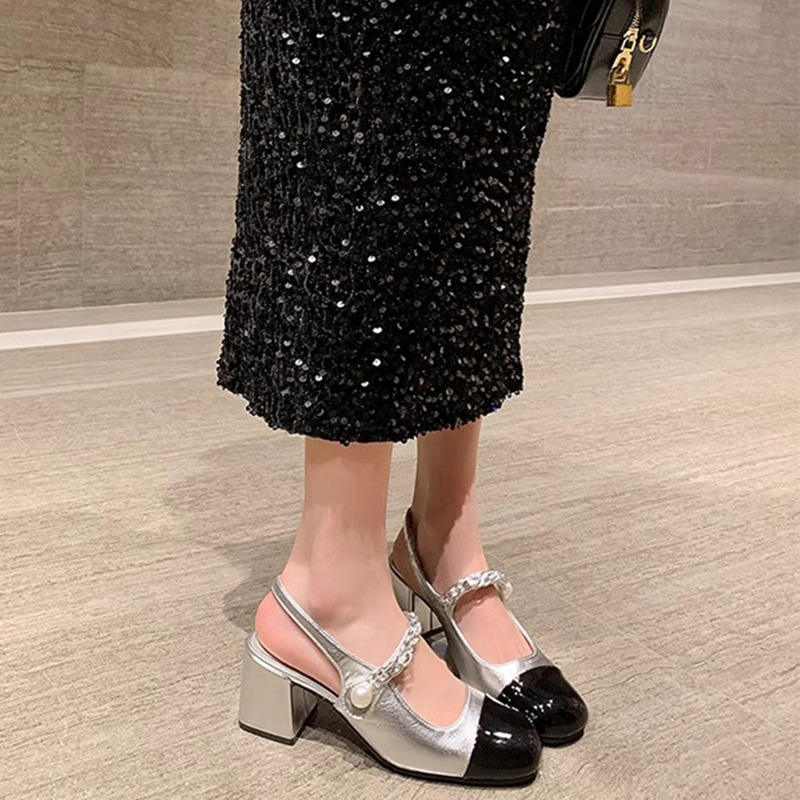 รองเท้าส้นตึกแบบสวมเปิดส้น หัวมน สีสันตัดกัน สไตล์เรโทรสำหรับผู้หญิง พร้อมสายรัดข้อเท้าแบบฝรั่งเศส รุ่นแมรี่เจน