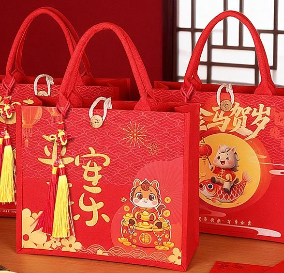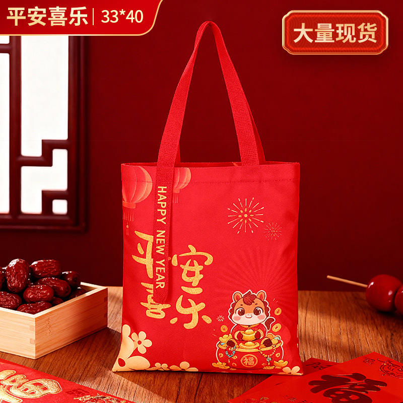 กระเป๋าโท้ทพับได้รักษ์โลก 3 มิติ สำหรับเทศกาลปีใหม่/ตรุษจีน พร้อมหูหิ้วผ้าแคนวาส พิมพ์โลโก้ด้วยผ้าไหม พิมพ์ลายสกรีน จุของได้เยอะ เหมาะสำหรับเป็นของขวัญ