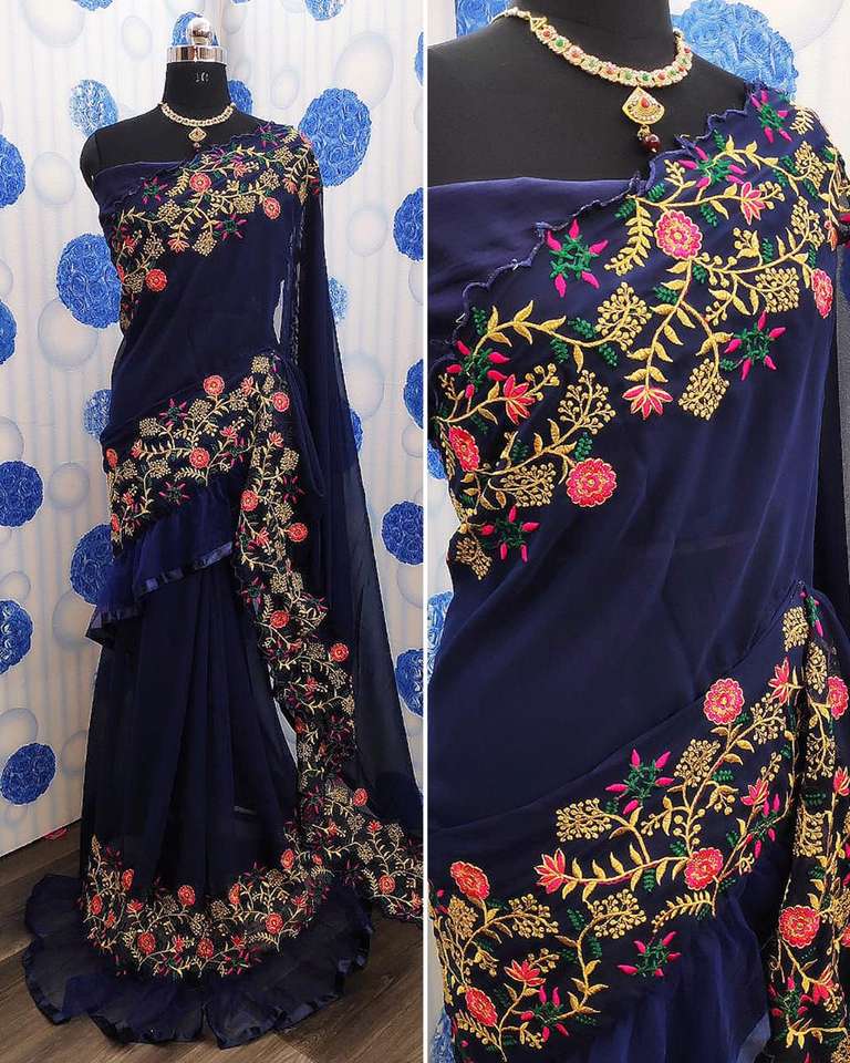 ชุดส่าหรีผ้าไหมเนื้อนุ่มจากบอลลีวู้ดพร้อมด้วยเสื้อที่ไม่มีการเย็บปักขอบสีฟ้าสวยงามมาใหม่
