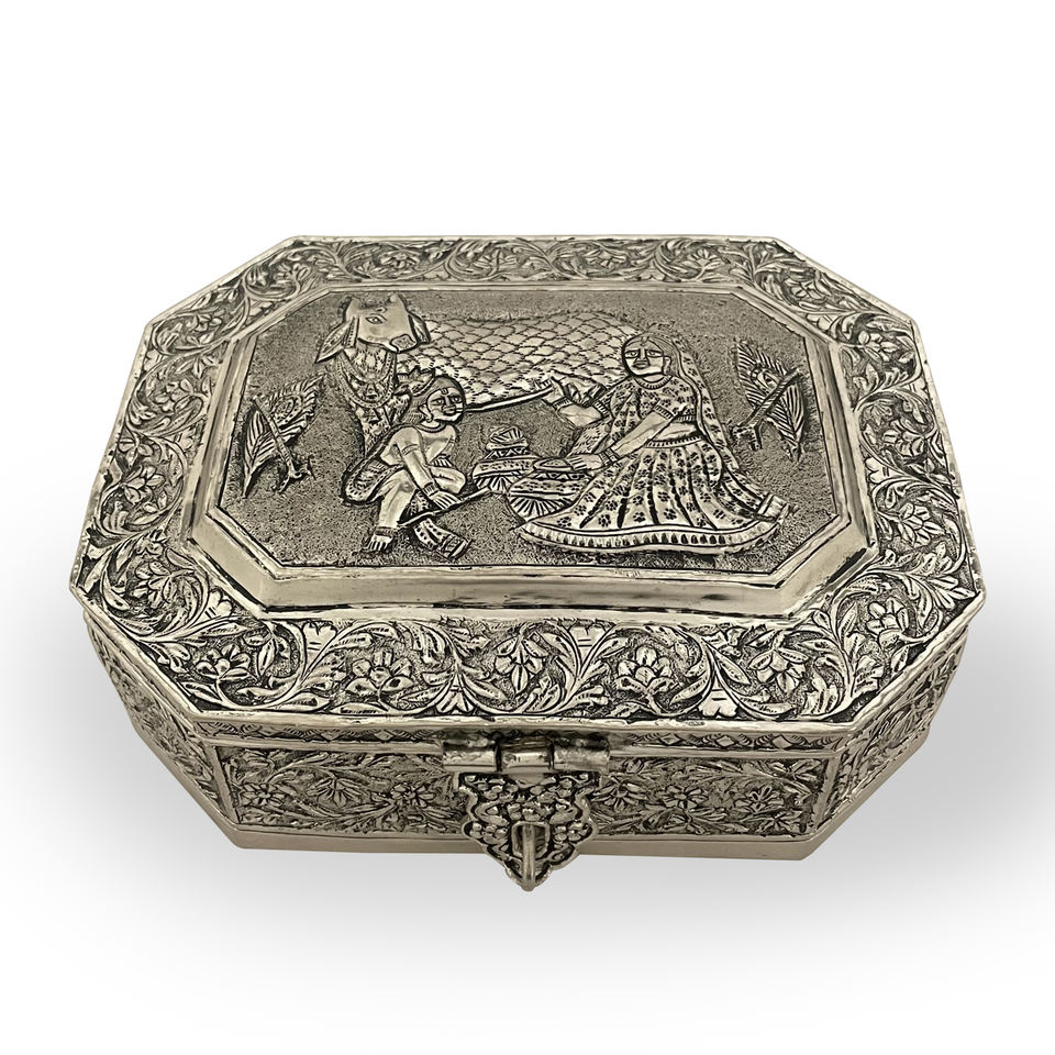 กล่องแกะสลักงานชุบเงินโบราณ,พร้อมแกะลายกฤษณะ Radha สำหรับใส่กระดาษทิชชู่และปาก