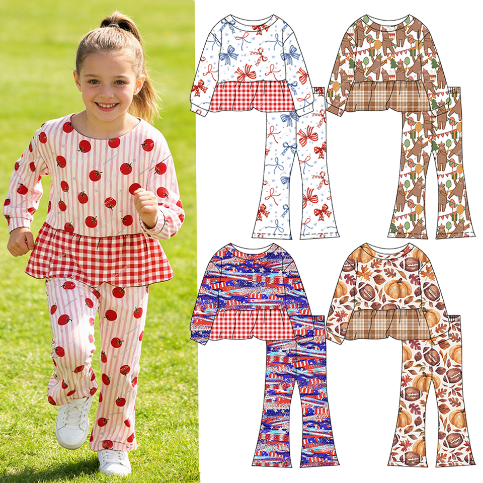 ชุดเซ็ต 2 ชิ้น สำหรับเด็กผู้หญิง ลายพิมพ์ตามสั่ง กางเกงขาบาน แขนยาวทรงเปปลัมและขากระดิ่ง สวมใส่สบาย เหมาะสำหรับใส่ในชีวิตประจำวัน