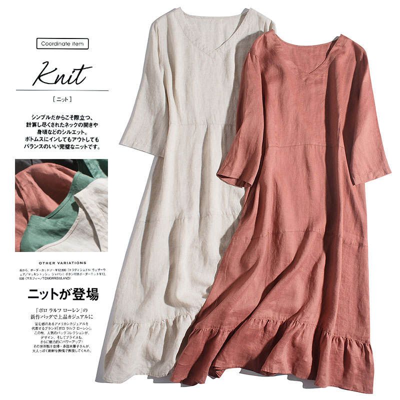 ชุดเดรสผ้าลินินคอวีบางสไตล์ใหม่สำหรับผู้หญิงกระโปรงยาวแต่งระบายผ้าลินินแนววรรณกรรมป่ากระโปรงทรงหางปลา