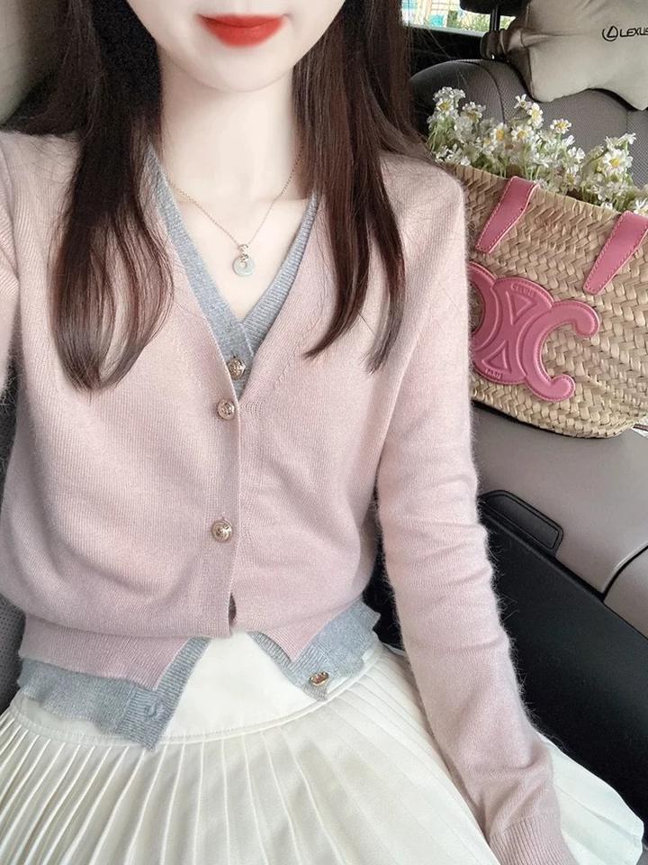 คาร์ดิแกนถักคอวีสองชิ้นสำหรับผู้หญิงเสื้อกันหนาวสีชมพูใหม่
