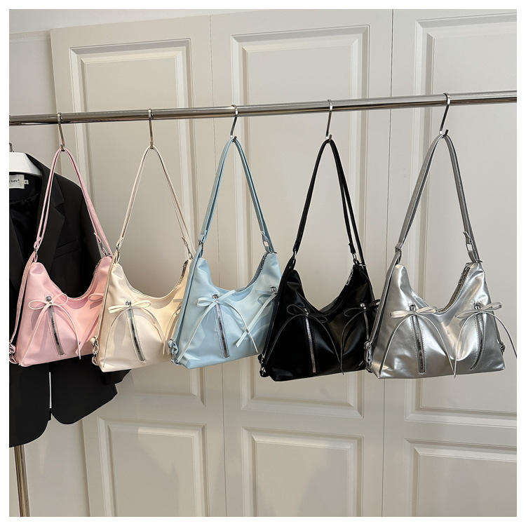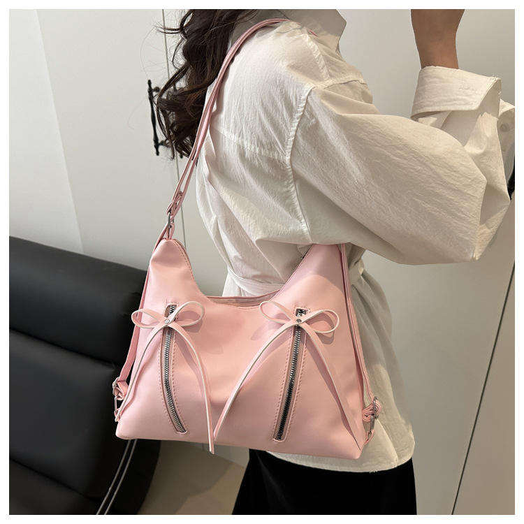 กระเป๋าสะพายไหล่ผู้หญิงรุ่นใหม่ สไตล์เกาหลี หนัง PU แต่งโบว์ใต้วงแขน ดีไซน์นุ่มนวลทันสมัย ปิดด้วยซิป