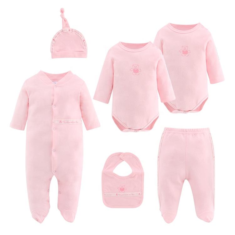 Contain:2pcs romper 1 sleepsuit 1 pant 1hat 1 bib/set
